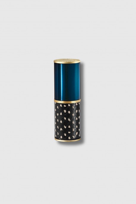 Cet étui Mezzanotte signé Dries Van Noten est un rouge à lèvres rechargeable. Objet de beauté, avec des écrins rechargeables aux imprimés contrastés sur le haut et le bas.