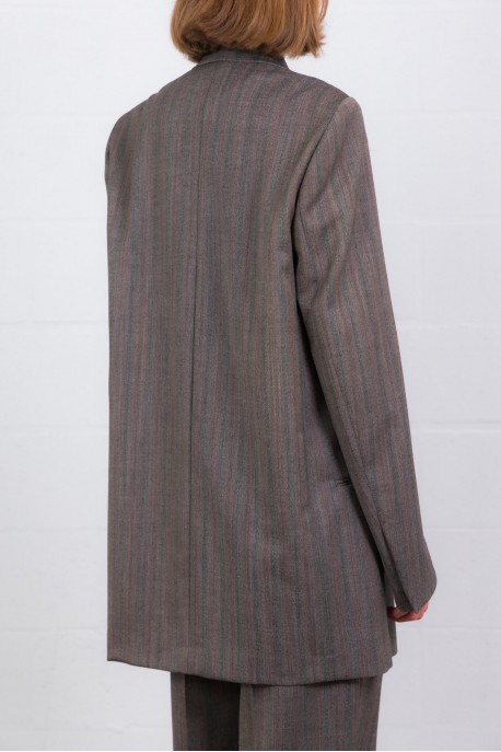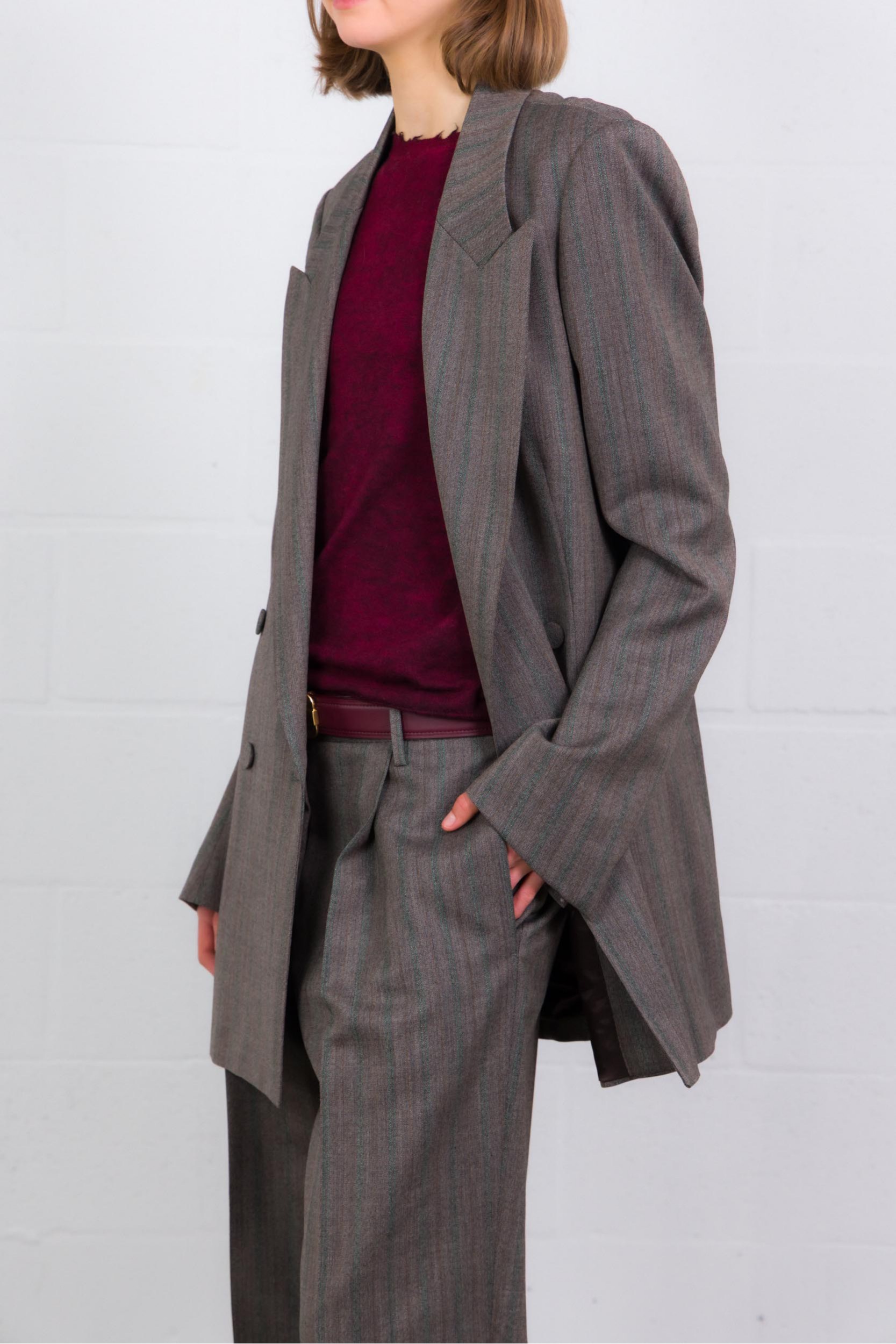 Ce blazer à double boutonnage gris est signé Dries Van Noten. Confectionné en laine mélangée grise, il présente une coupe longue, un col à revers cranté, une fermeture à boutons sur le devant, des poches fendues sur les côtés et des manches longues à poignets boutonnés.