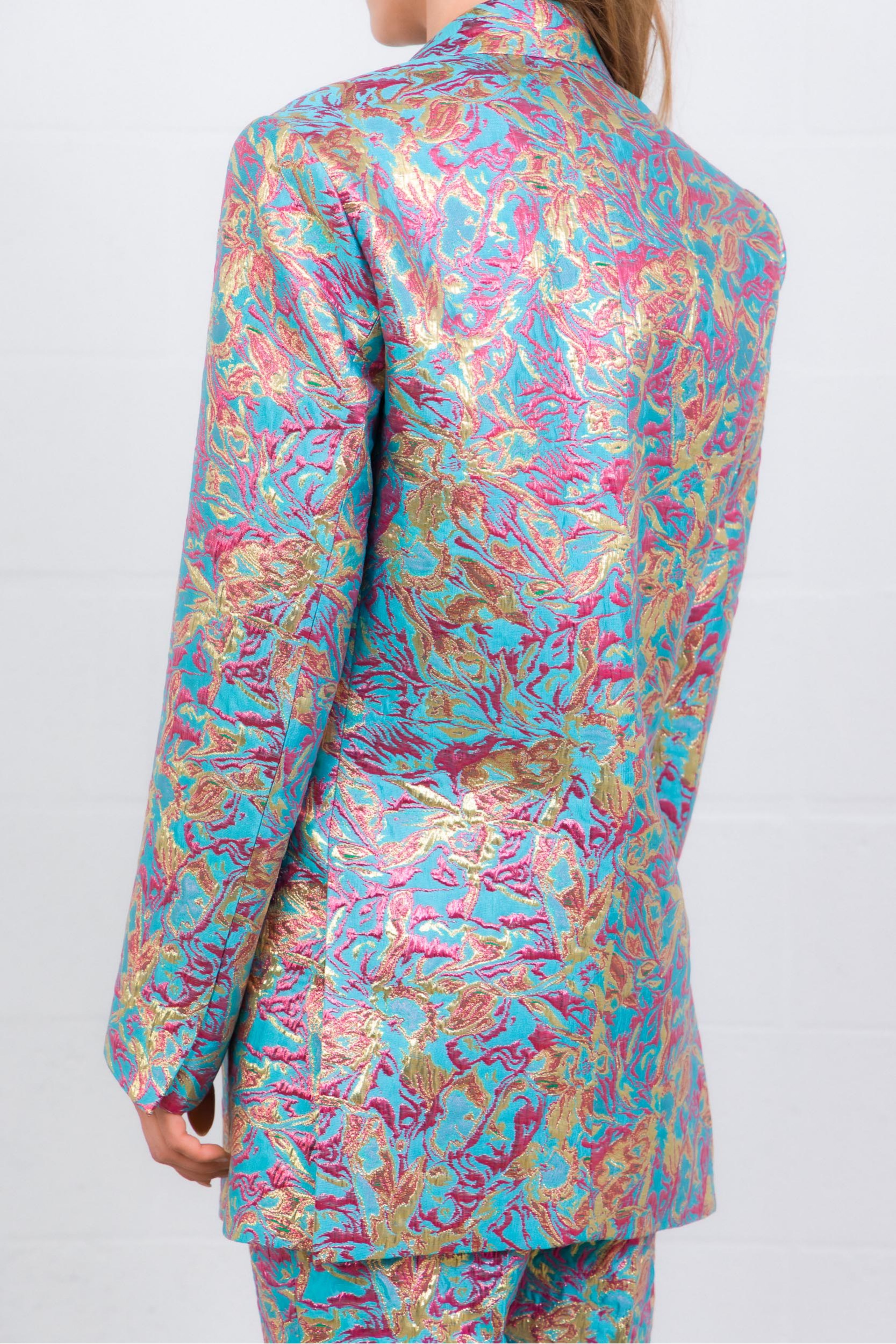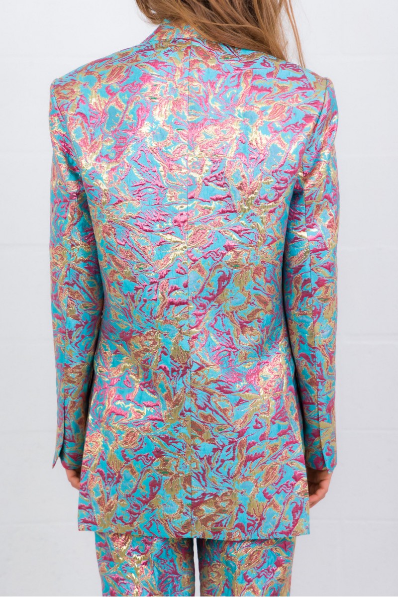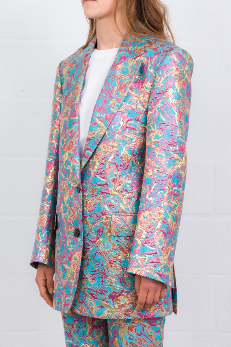 Ce blazer Basti floral jacquard multicolore est signé Dries Van Noten. Confectionné en jacquard floral lamé, il présente une coupe droite structurée avec un double boutonnage. Pièce forte et élégante, il apporte une touche artistique et sophistiquée à la silhouette.