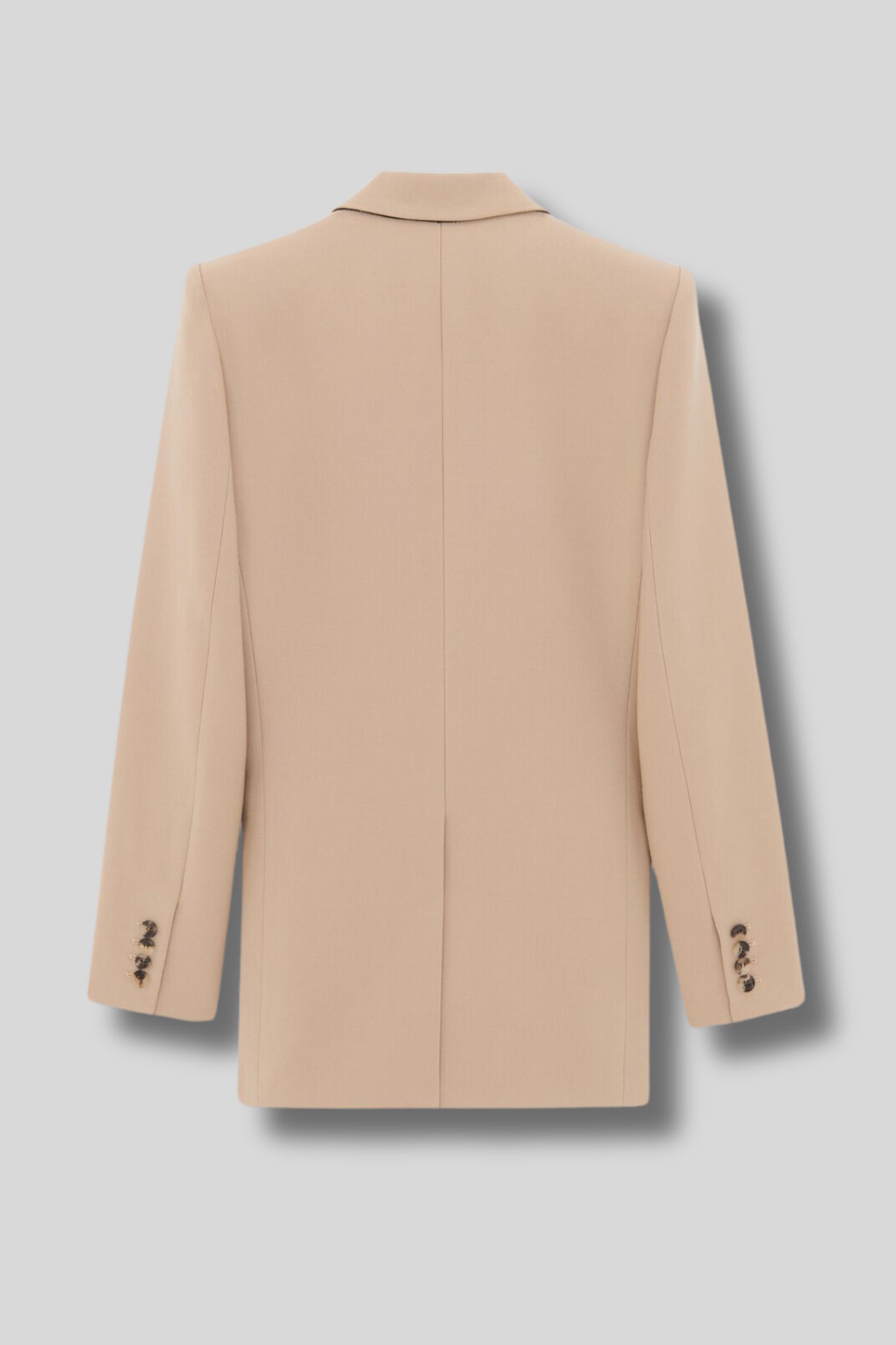 Ce blazer beige à double boutonnage est signé Saint Laurent. Celui-ci est confectionné en laine responsable. Il est détaillé de poches plaquées, d'une fermeture à 6 boutons et d'épaulettes permettants un soutien de la carrure.