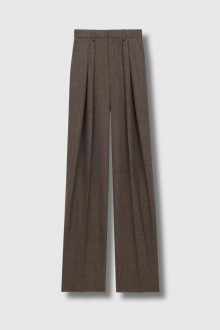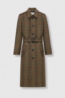 Casquette en feutrine, manteau prince-de-galles, jupe-culotte pied-de-poule, chemise à carreaux et seau en daim Niki Saint Laurent s'harmonisent dans un ton automnal rassurant.