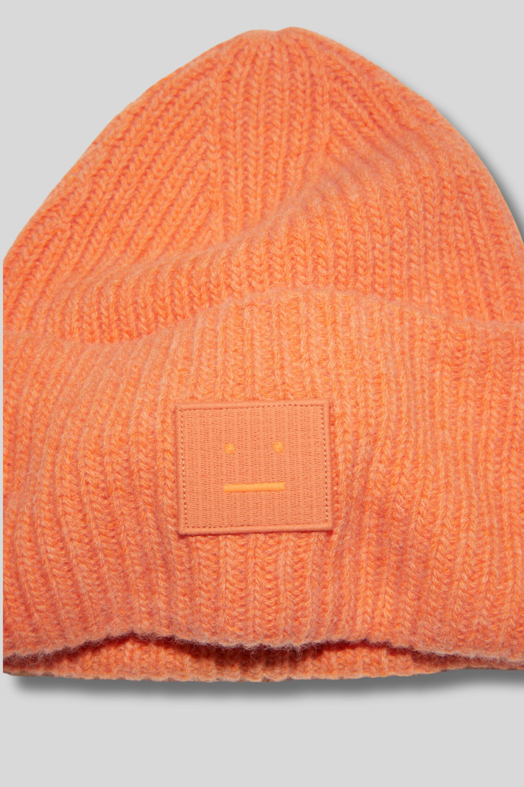 Ce bonnet en laine orange mandarine est signé Acne Studios. Il est réalisé en laine épaisse côtelée et présente un logo patch "Face" brodé.