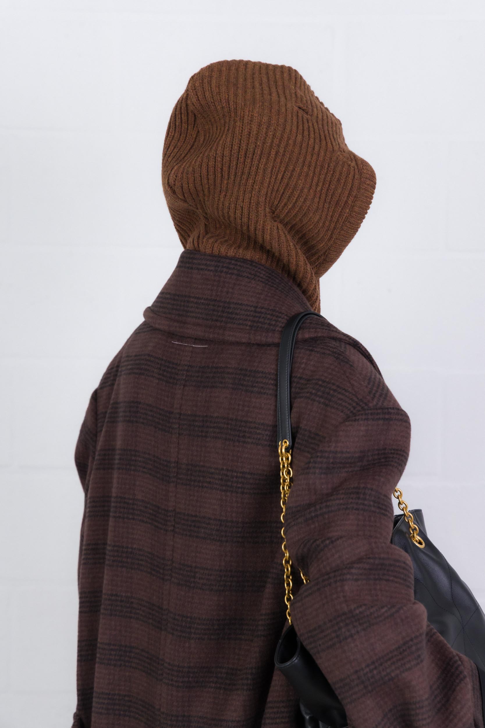 Cette cagoule en laine marron est signée MM6. Celle-ci présente un effet usé volontaire et est détaillé d'un cordon de serrage.