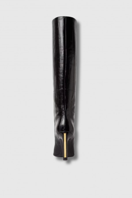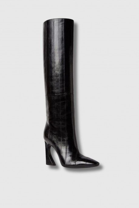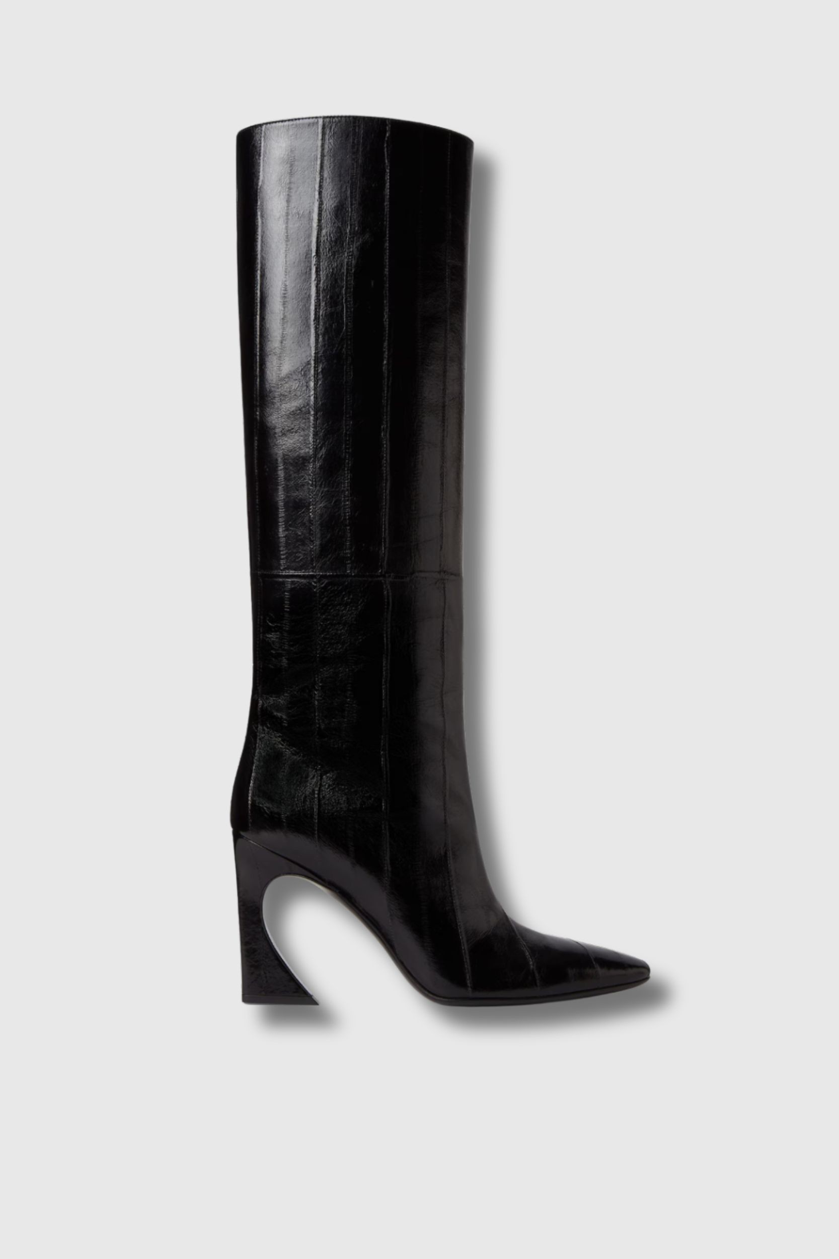Ces bottes à talons 90 mm sont signées Fendi. Issues de l’emblématique ligne Arco, elles présentent une silhouette tube élégante à bout pointu et un talon haut raffiné, orné d’un détail en métal gravé du logo. Confectionnées en cuir de myxine noir brillant, elles allient luxe et caractère. Le talon revêtu et la semelle en cuir parachèvent ce modèle sophistiqué et intemporel.