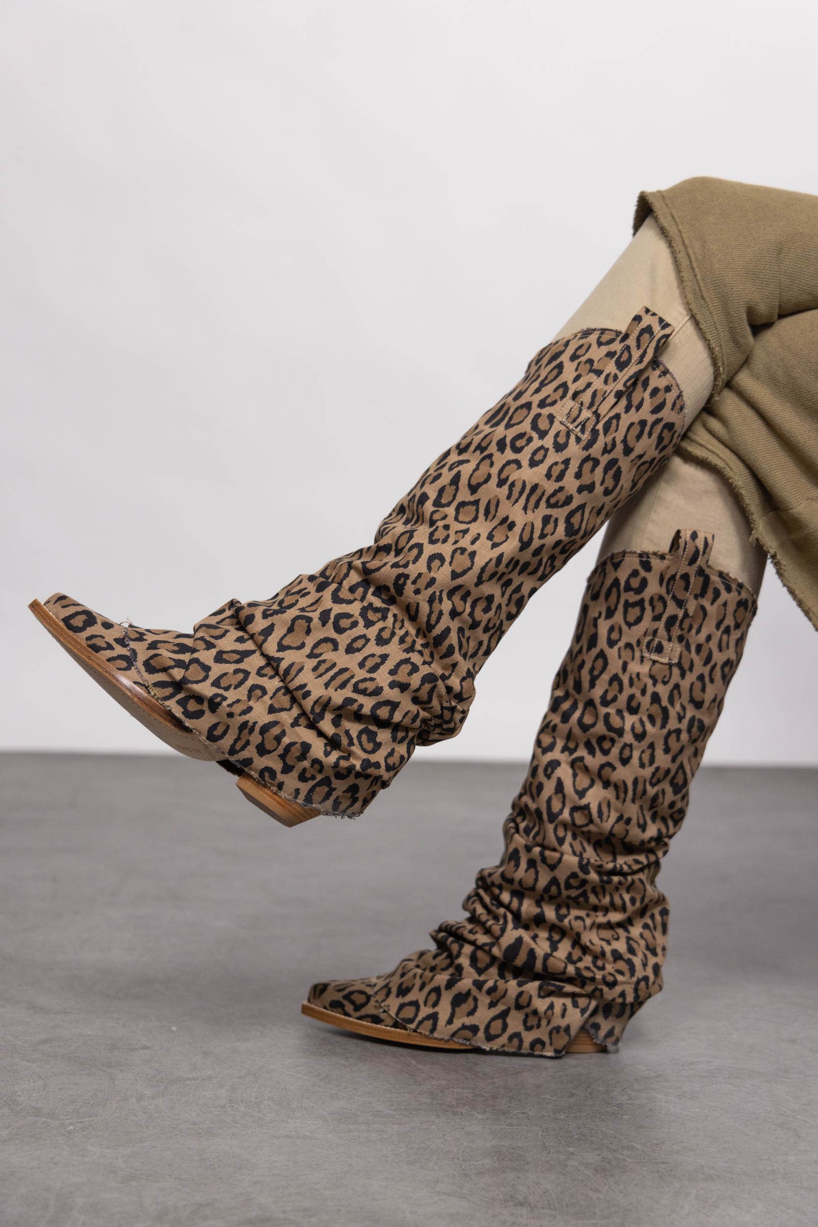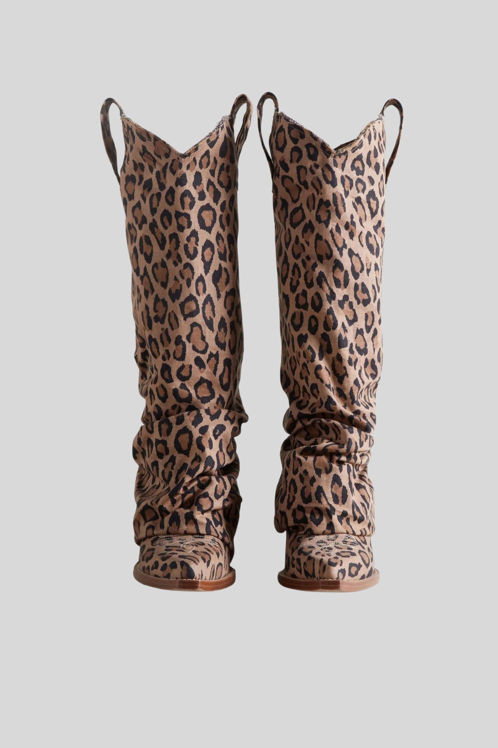 Ces bottes de cow-boy mi-longues sont signées R13. Elles présentent un motif léopard imprimé et la doublure et la semelle sont en cuir italien.