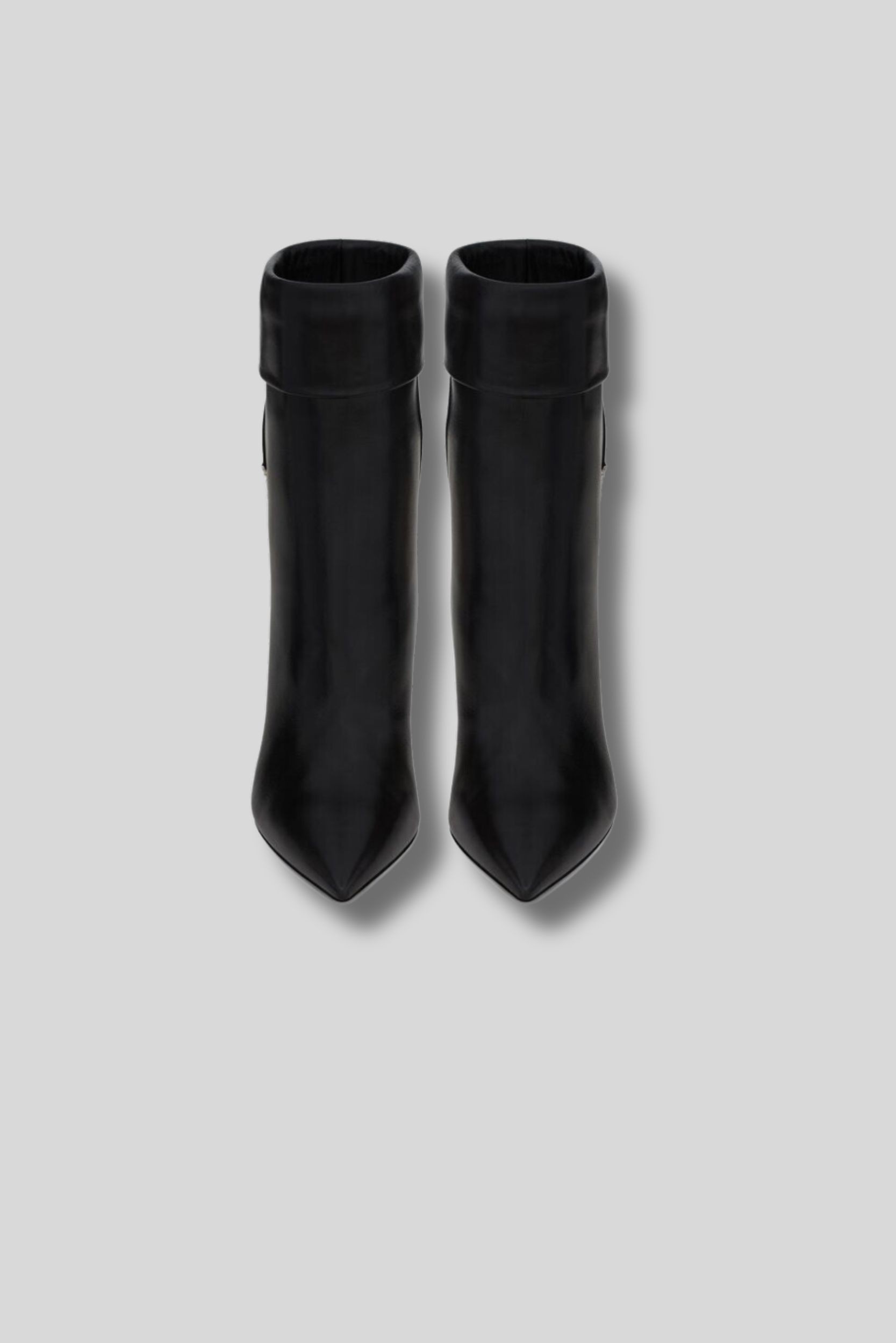 Ces boots Niki en cuir noir sont signées Saint Laurent. Elles présente un bout pointu, un talon conique et sont ornées du logo YSL Cassandre.