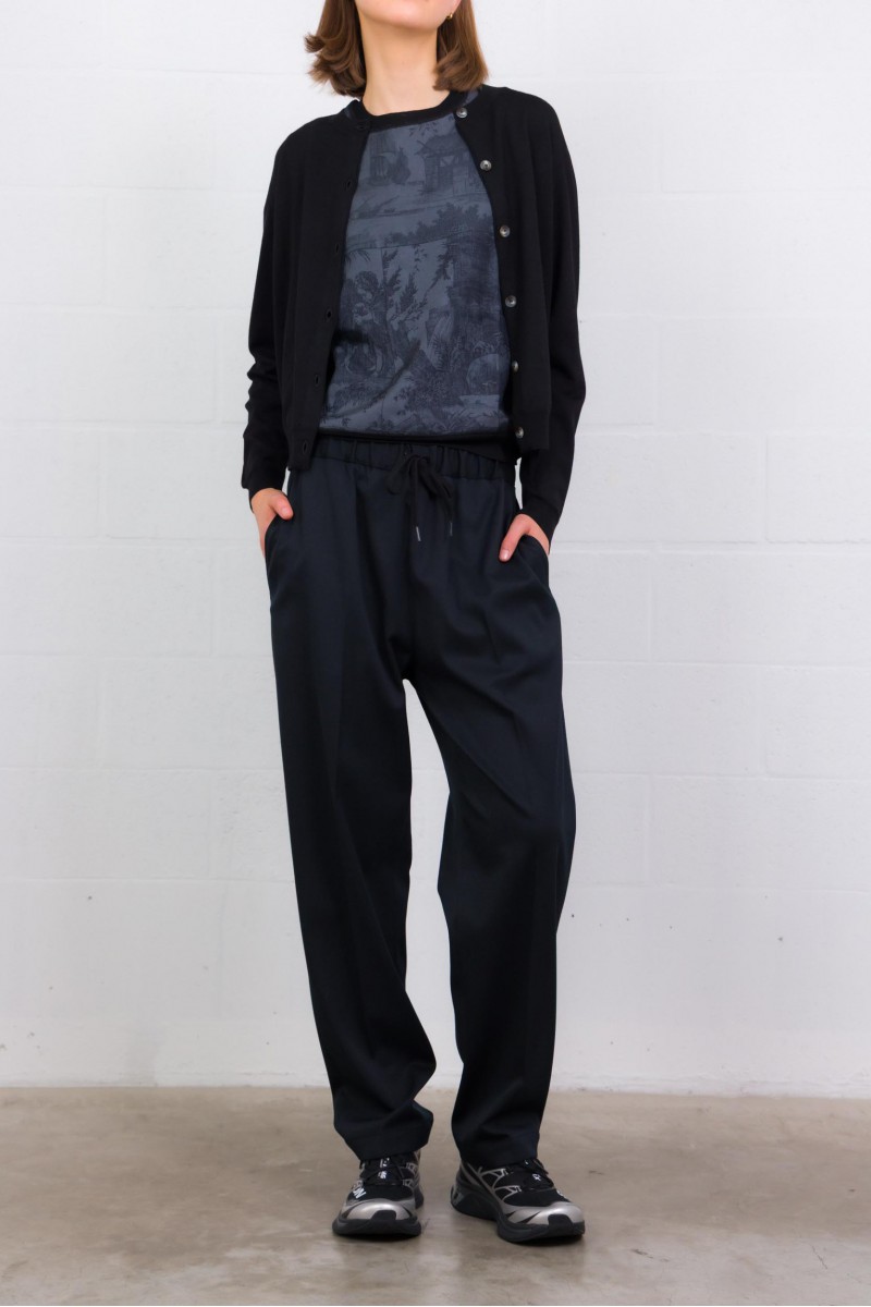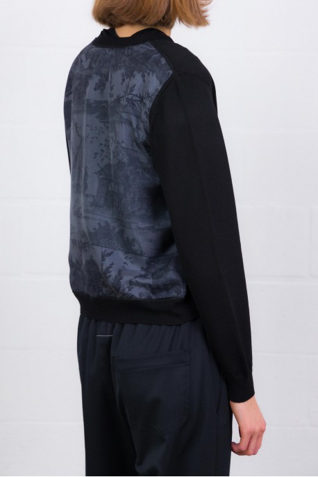 Ce cardigan en soie et cachemire gris est signé Pierre-Louis Mascia. Il présente une coupe droite, un col rond, des manches longues et une fermeture boutonnée sur le devant. Le dos et l’avant sont ornés d’un imprimé inspiré des paysages classiques, contrastant avec les manches et les finitions unies. Un modèle alliant douceur, raffinement et modernité.