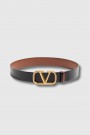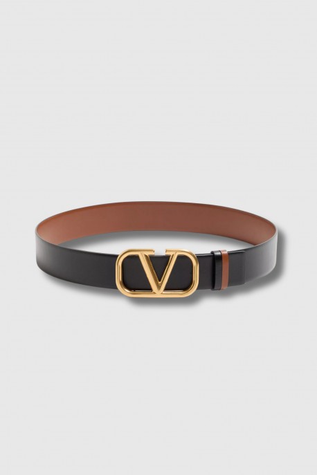 Cette ceinture VLogo en cuir marron et noir est signée Valentino Garavani. Réversible, elle est confectionnée en cuir de veau brillant et ornée de la boucle emblématique VLogo Signature à la finition en laiton vieilli.