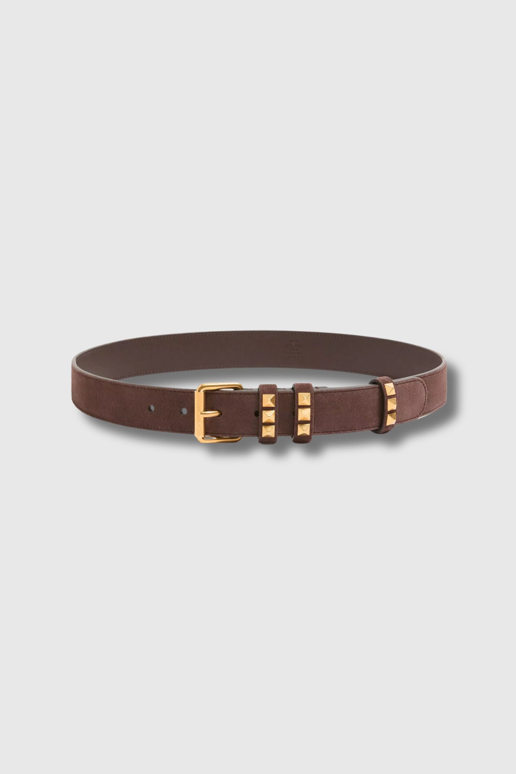 Cette ceinture en daim marron signée Valentino Garavani appartient à la ligne Flaneuse et se distingue par son extérieur en daim souple associé à un intérieur en cuir de veau raffiné. Elle est sublimée par une boucle finition Antique Brass qui apporte une touche vintage, ainsi que par des passants en cuir ponctués des emblématiques studs de la Maison, pour une allure sophistiquée et résolument couture.