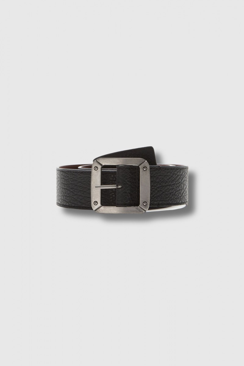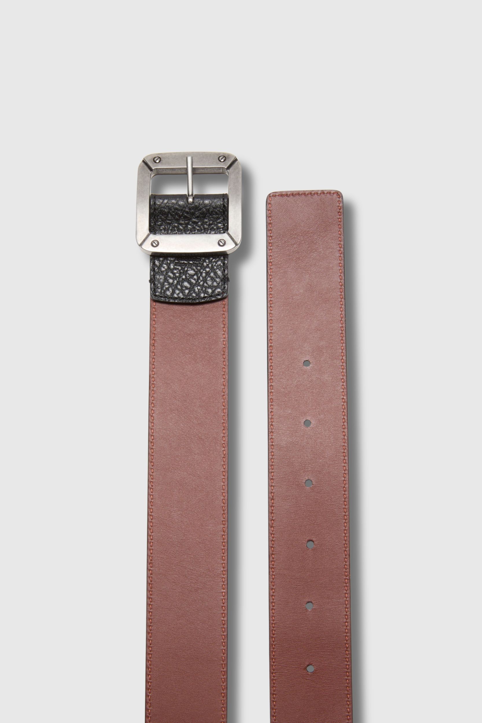 Cette ceinture réversible en cuir grainé noir est signée Acne Studios. Conçue comme un accessoire unisexe, elle associe cuir grainé et cuir de veau lisse pour une allure élégante et polyvalente. Son design réversible permet de varier les styles, tandis que la boucle réversible avec logo, à finition métal argent antique, apporte une touche sophistiquée. Le modèle est complété par un logo Acne Studios embossé sous la boucle.