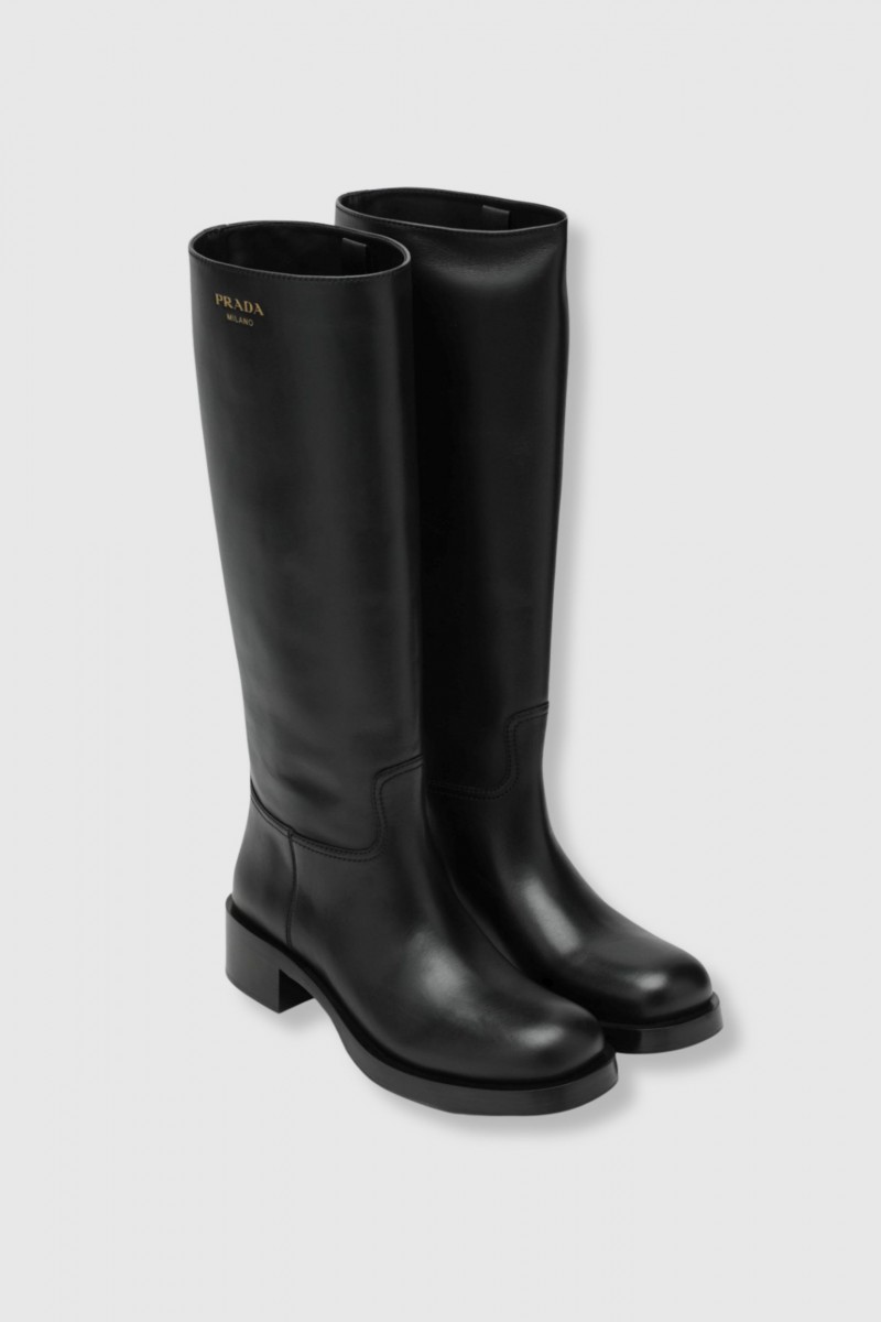 Bottes Prada en cuir noir lisse, alliant silhouette contemporaine et savoir-faire italien. Conçues avec une tige haute structurée, un talon carré stable et une semelle crantée pour une démarche assurée, elles combinent esthétique minimaliste et fonctionnalité. Le cuir de qualité supérieure et les finitions soignées renforcent l’allure sophistiquée, tandis que la teinte noire intemporelle facilite l’association avec des looks urbains, tailoring ou casual.