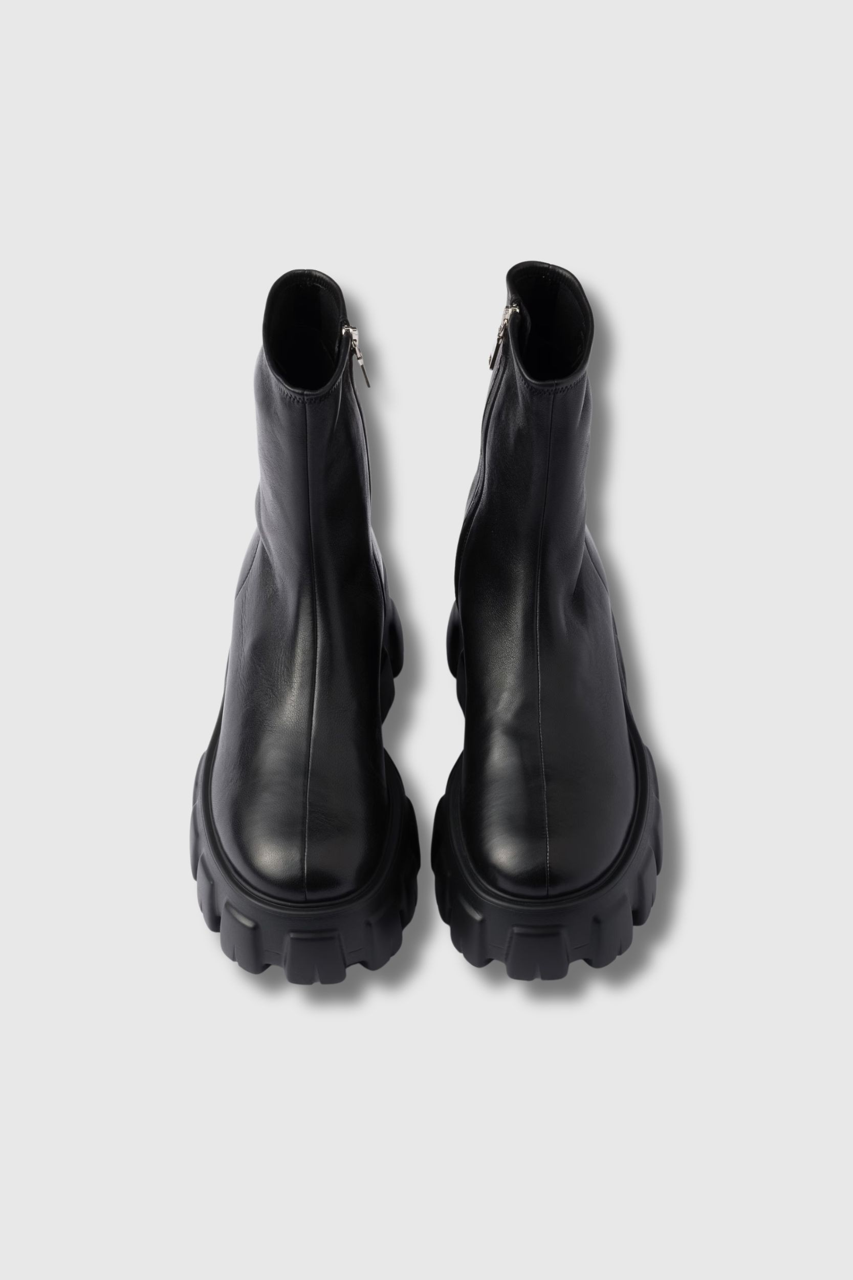 Ces bottines Monolith incarnent un design affirmé et contemporain. Réalisées en cuir Nappa stretch noir, elles présentent une silhouette fuselée rehaussée d’une semelle maxi-lug imposante de 55 mm, emblématique de la ligne Monolith. La fermeture zippée latérale facilite le chaussage, tandis que l’intérieur cuir assure un confort optimal. Le talon carré et le logo triangulaire émaillé sur le côté ajoutent une touche de signature avant-gardiste.