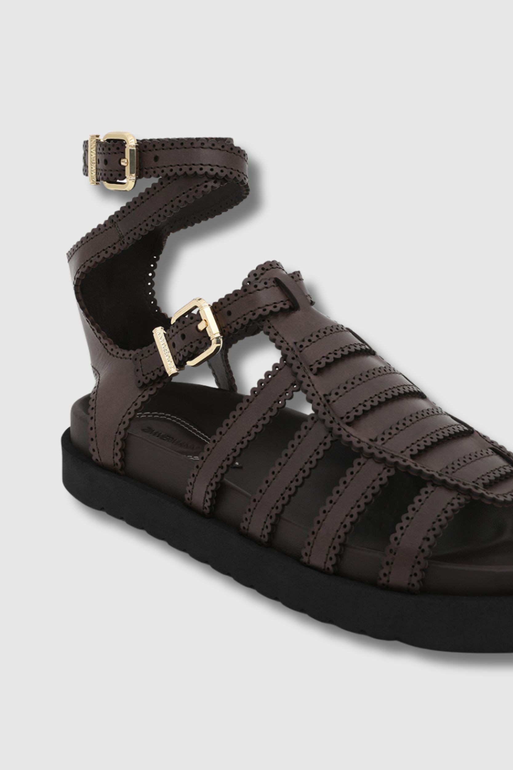 Ces sandales de style gladiateur en cuir marron sont signées Zimmermann. Elles présentent une bride ajustable à boucle au niveau de la cheville.