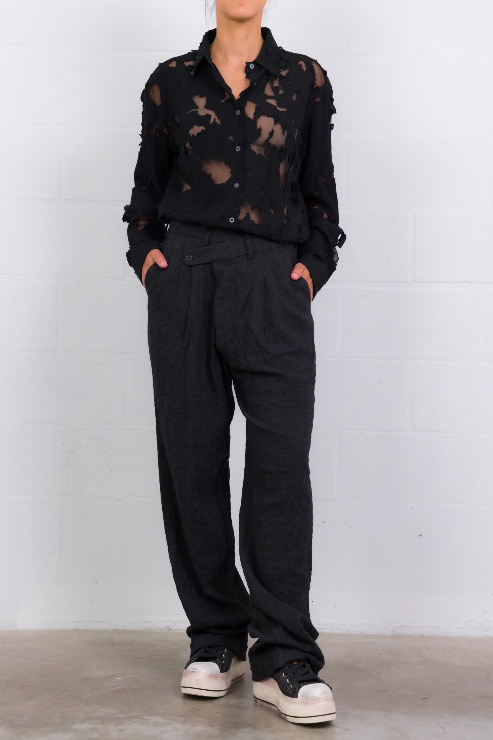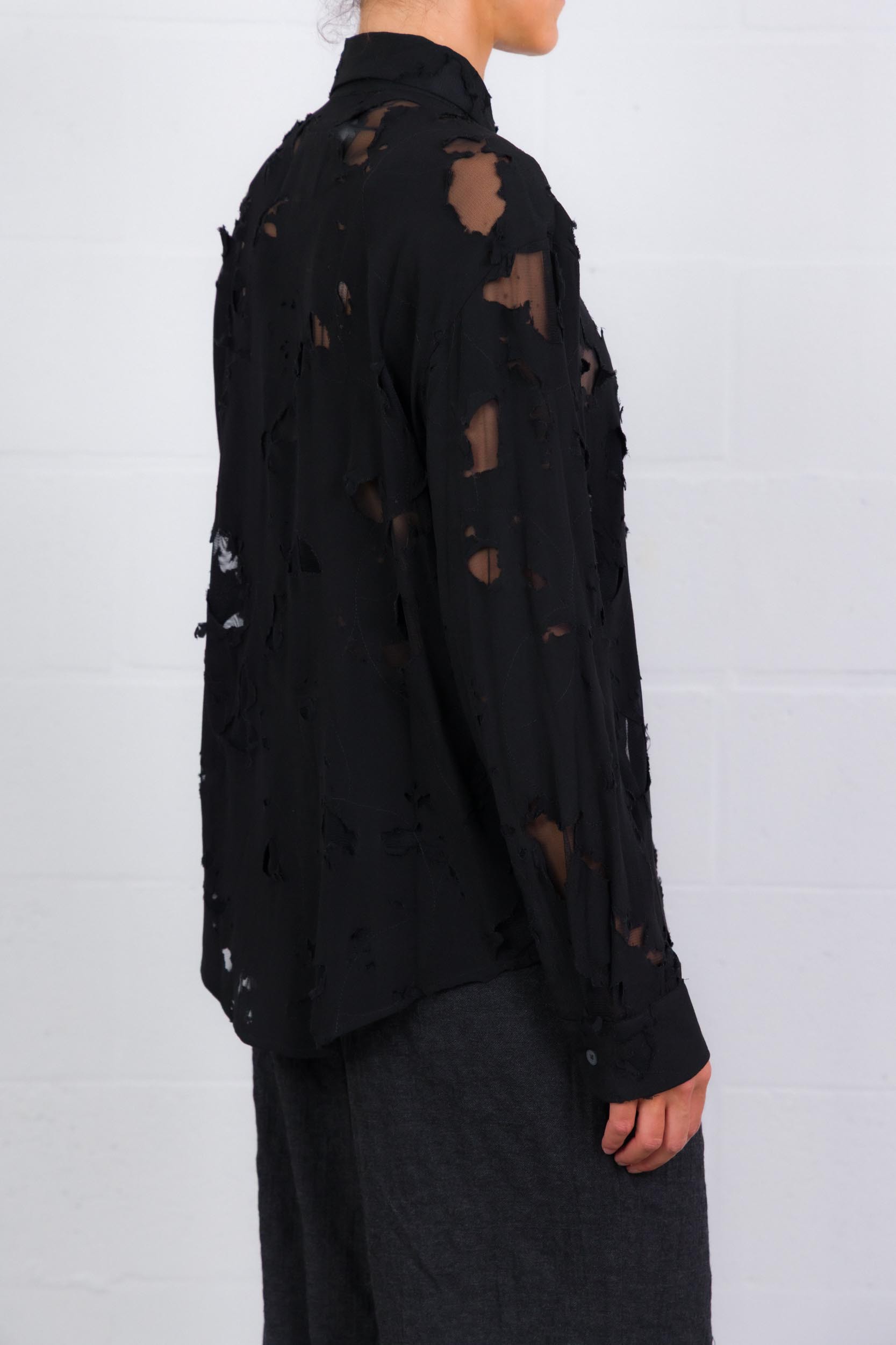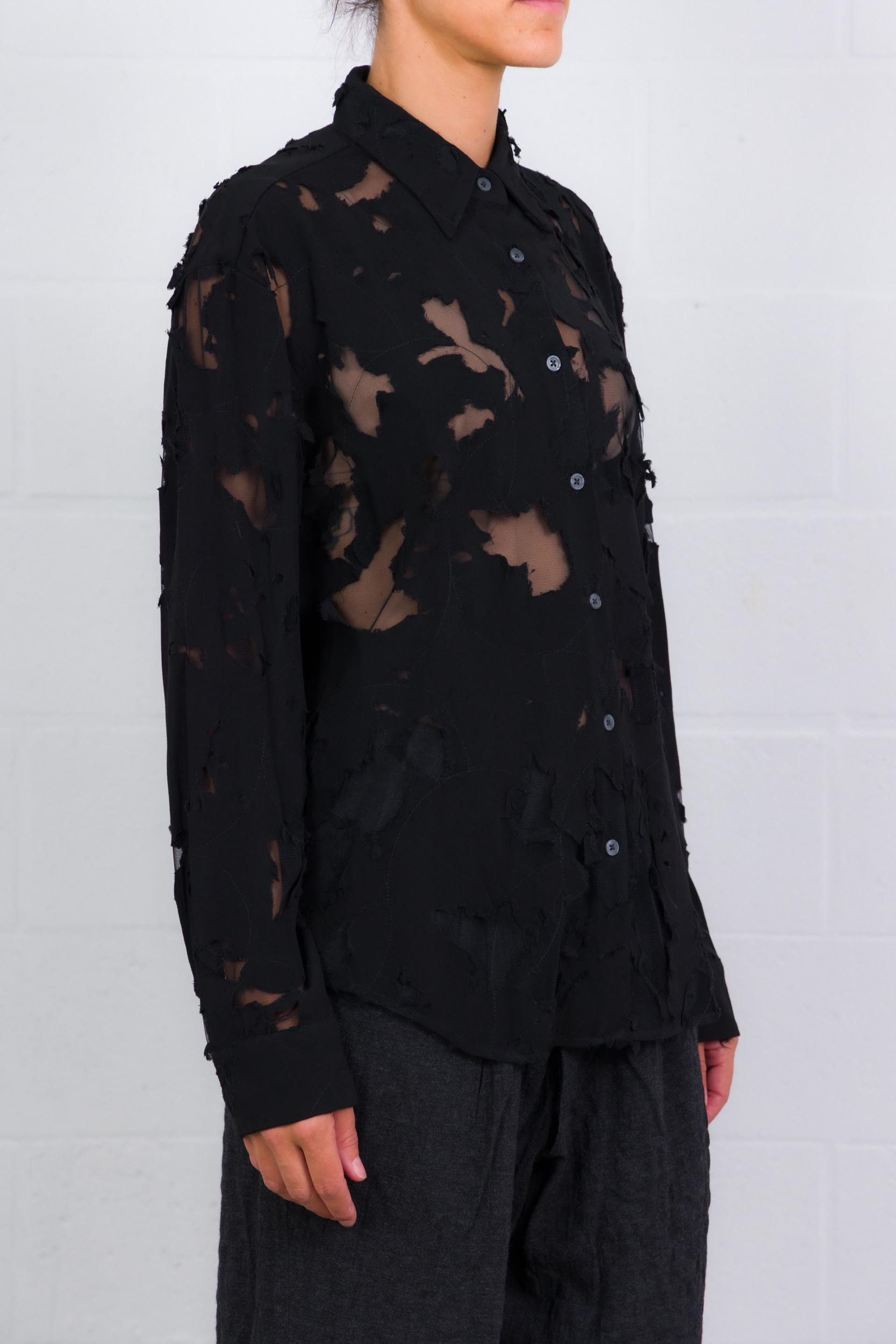 Cette chemise en chiffon dévoré signée R13 séduit par son jeu subtil de transparences et son allure contemporaine. Dotée d’un col chemise classique, d’une fermeture boutonnée sur le devant et de poignets ajustés par boutons, elle présente des finitions arrondies qui apportent fluidité et légèreté à la silhouette.