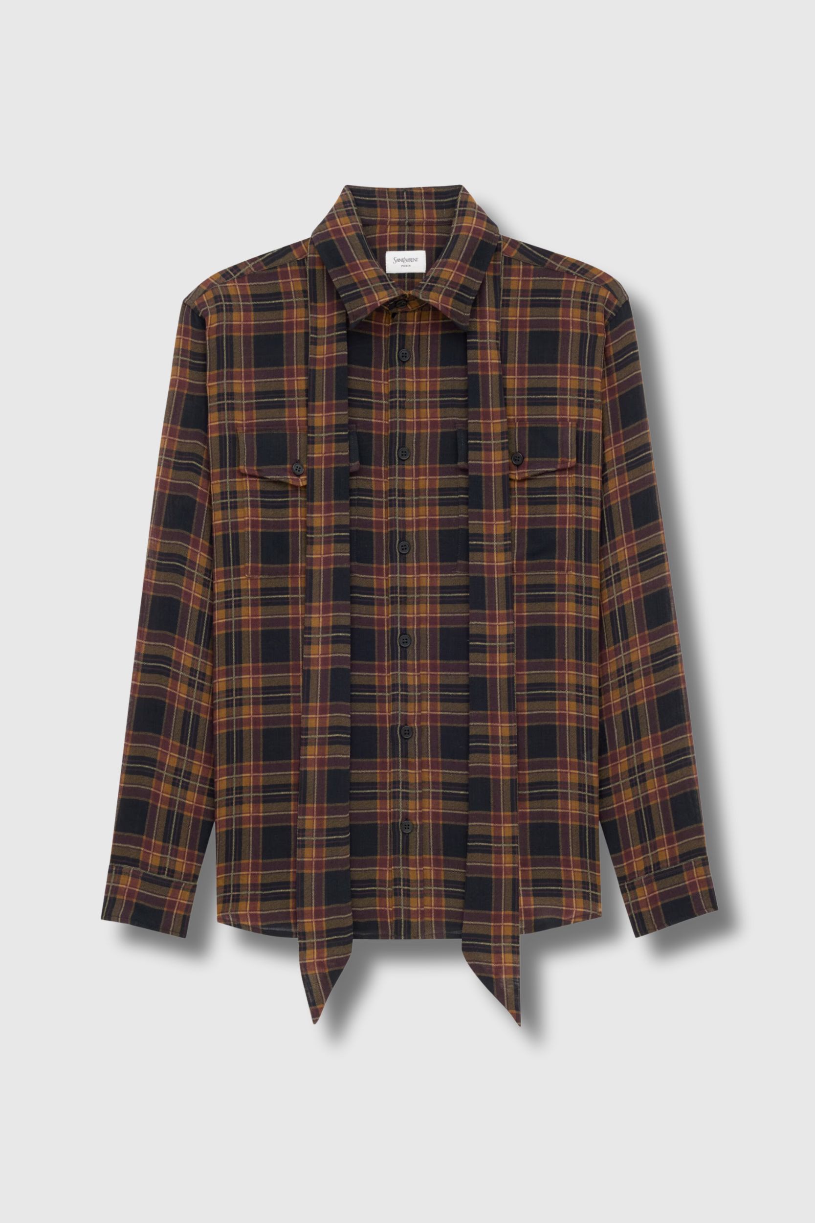La chemise Cassandre à lavallière en tartan de laine à motif écossais, signée Saint Laurent, revisite un grand classique de la Maison avec une allure à la fois affirmée et subtilement féminine. Confectionnée dans un coton léger, elle se distingue par sa coupe fluide et sa lavallière à nouer, apportant une touche de sophistication discrète à la silhouette.