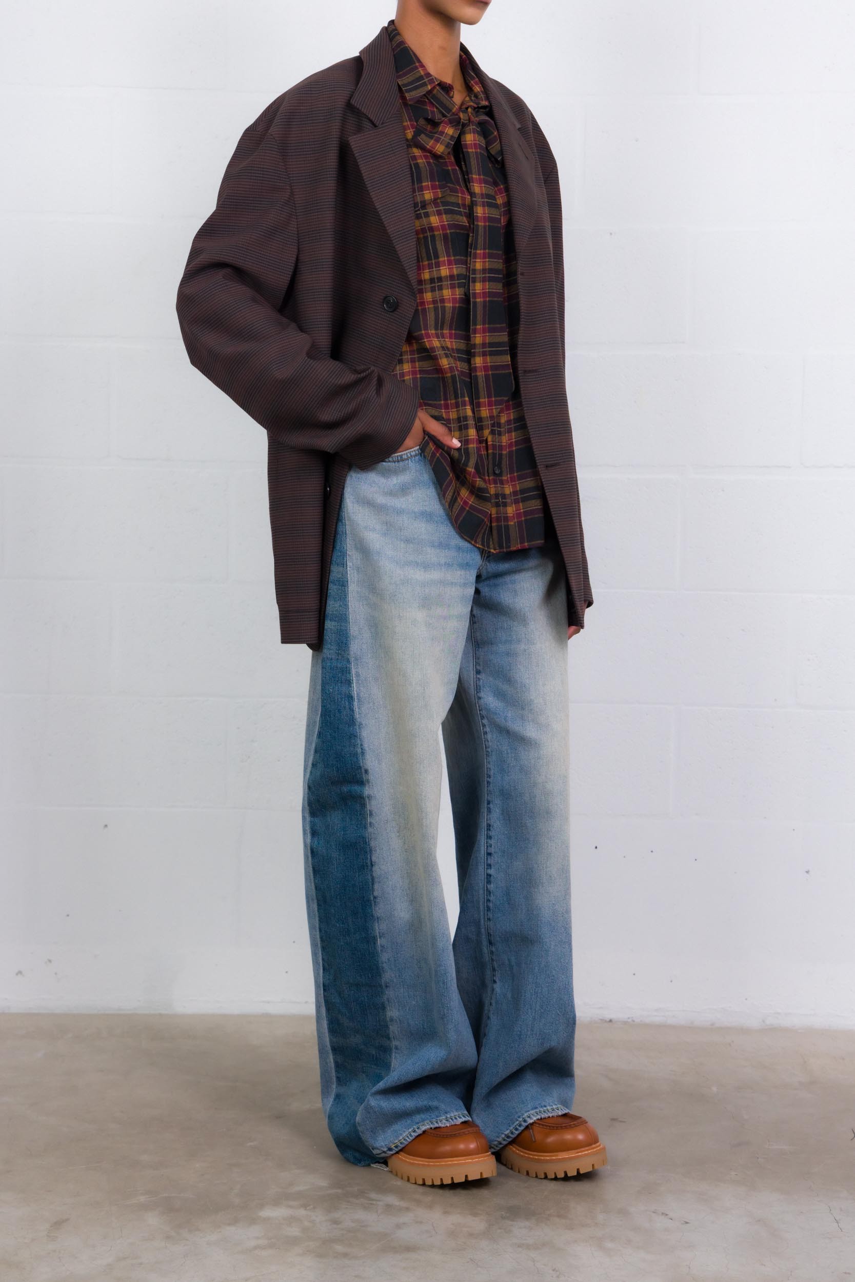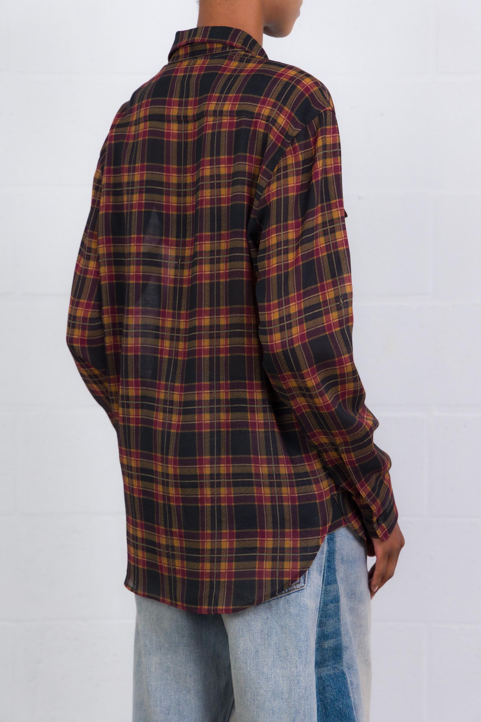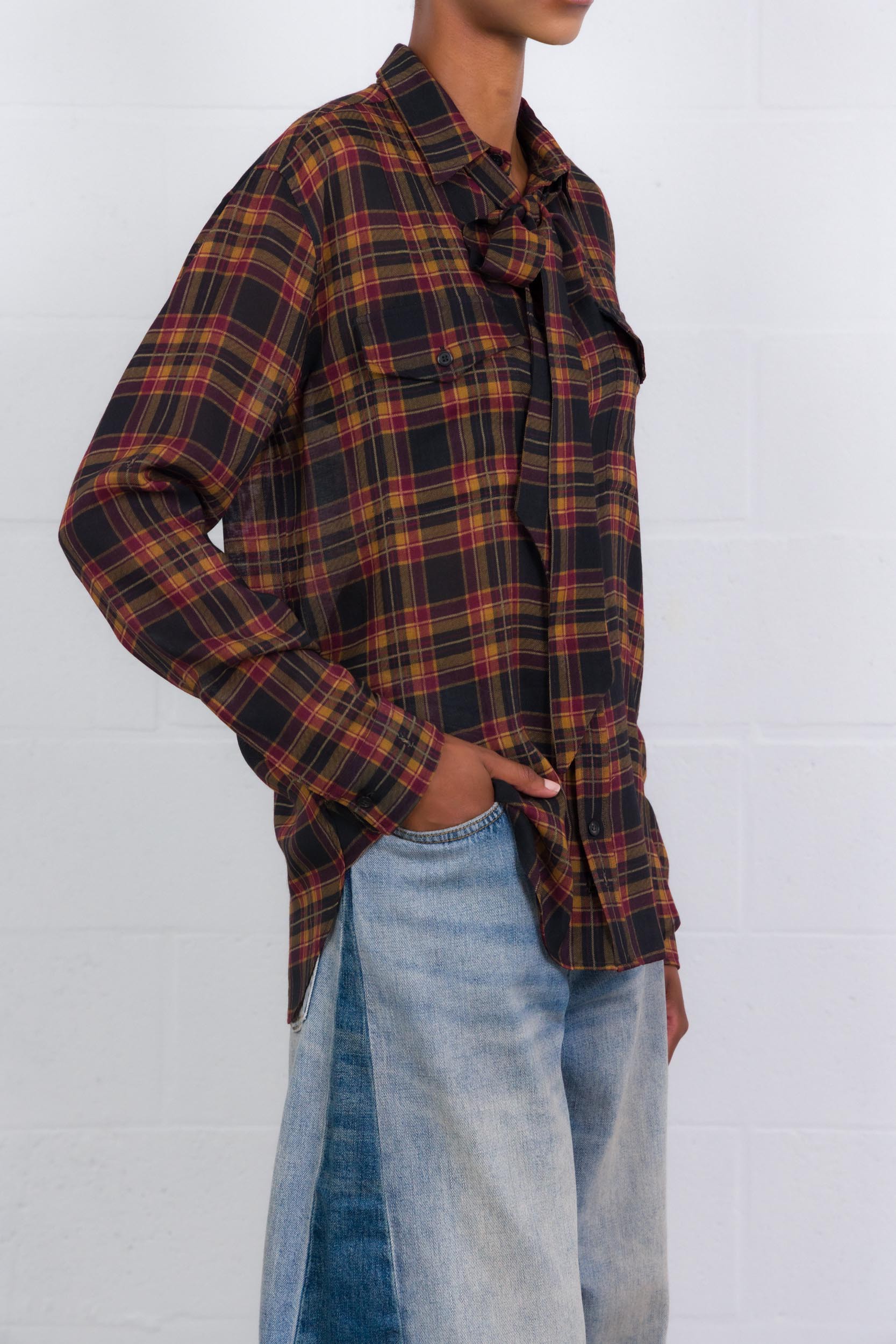 Le motif tartan aux tons bordeaux et noirs souligne une esthétique intemporelle, tandis que la broderie "Cassandre" ton sur ton apposée à l’ourlet incarne l’élégance emblématique de la griffe. Un modèle polyvalent, à porter rentré dans un pantalon taille haute ou sur un denim noir pour un look effortless.