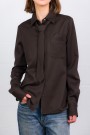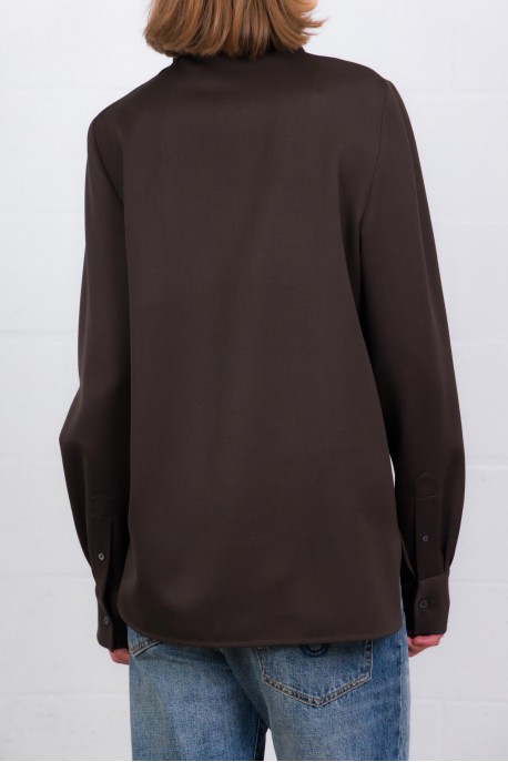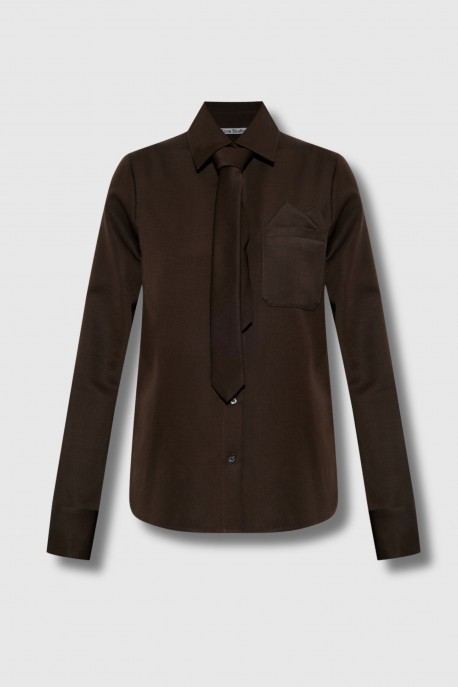 Cette chemise cravate marron est signée Acne Studios. Elle incarne le minimalisme scandinave dans toute sa finesse, mêlant tradition et modernité. Confectionnée en laine de qualité supérieure, elle séduit par sa teinte brun profond et sa texture mate légèrement satinée. Sa coupe droite et fluide souligne la pureté de la silhouette, tandis que le col rigide et les larges poignets boutonnés apportent une touche d’élégance. Une poche plaquée sur la poitrine, ornée d’un détail façon pochette, complète avec subtilité ce modèle au design soigné et intemporel.