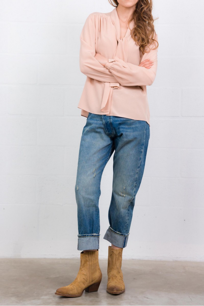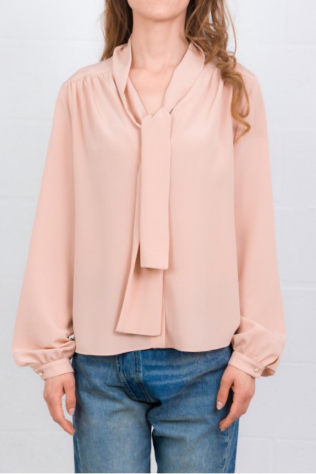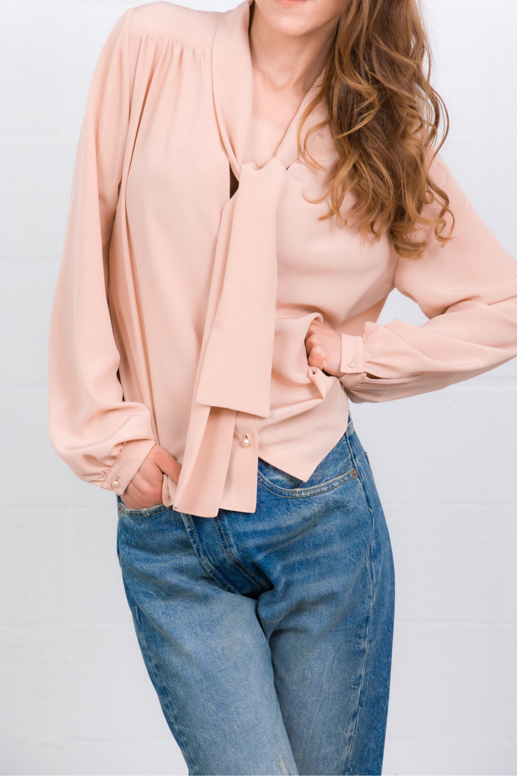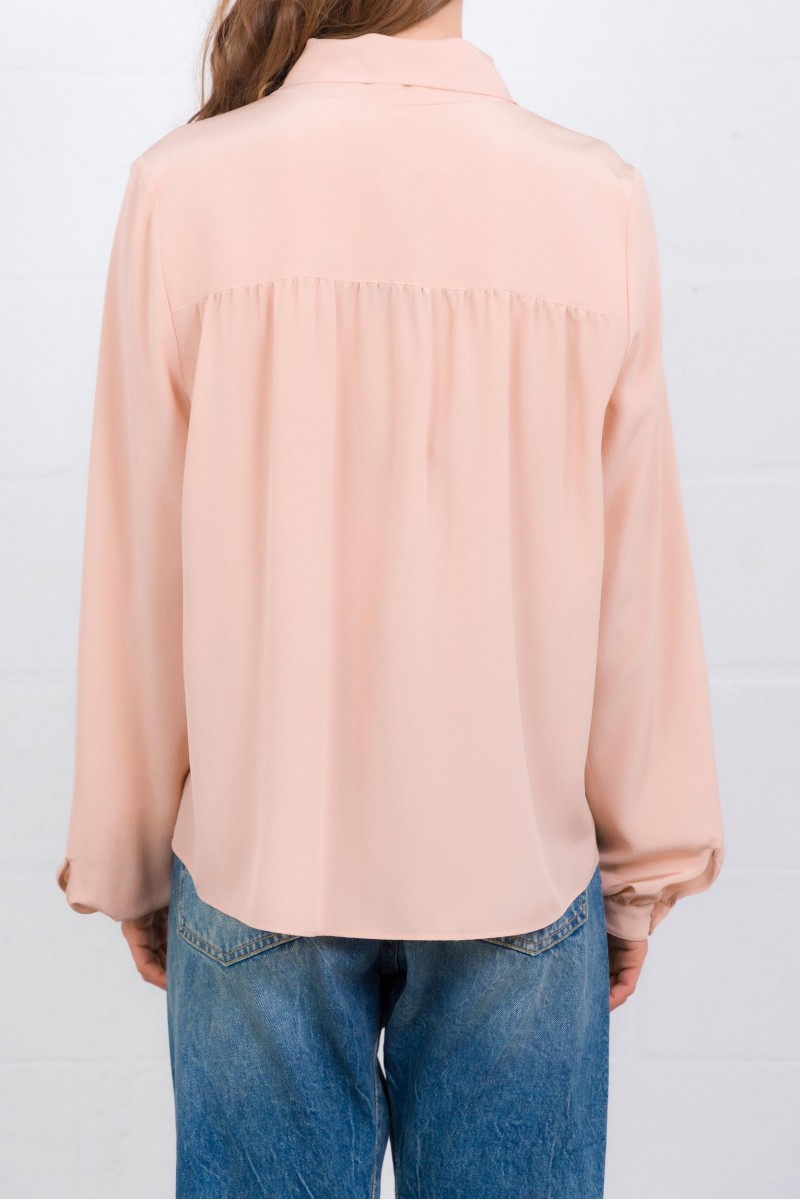 Cette chemise en crêpe de Chine rose est signée Valentino Garavani. Confectionnée en pure soie, elle se distingue par son foulard intégré à l’encolure et son col en V élégant. Sa fermeture boutonnée sur le devant souligne une allure fluide et féminine.