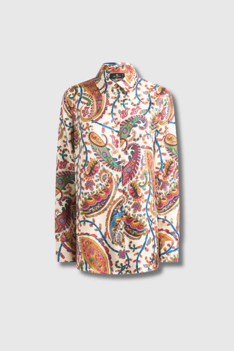 Cette chemise en twill de pure soie signée Etro, arborant un imprimé all-over mêlant motifs paisley et éléments floraux multicolores. Coupe « boyfit » décontractée, col classique, manches longues avec poignets boutonnés, et fermeture par boutons siglés.