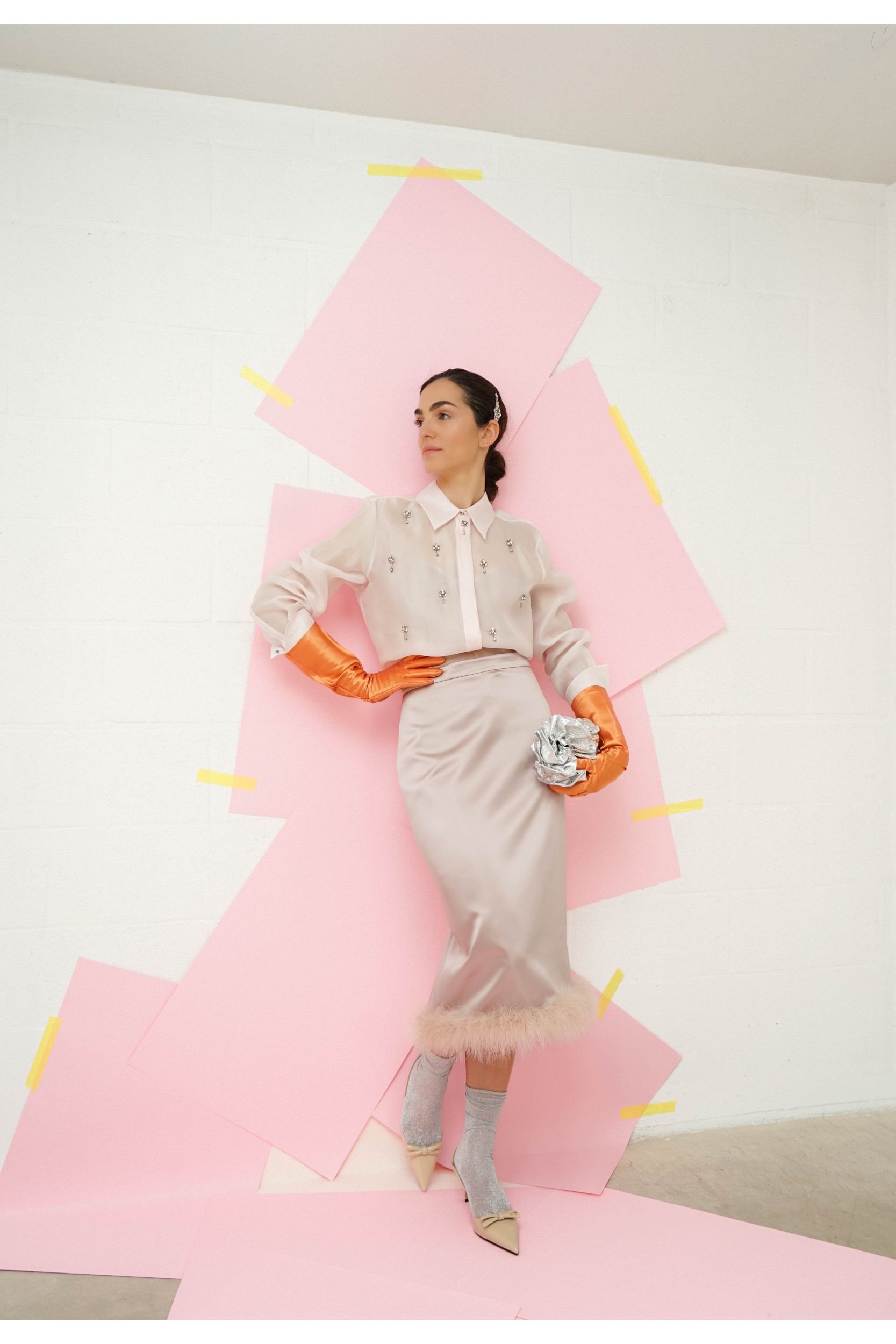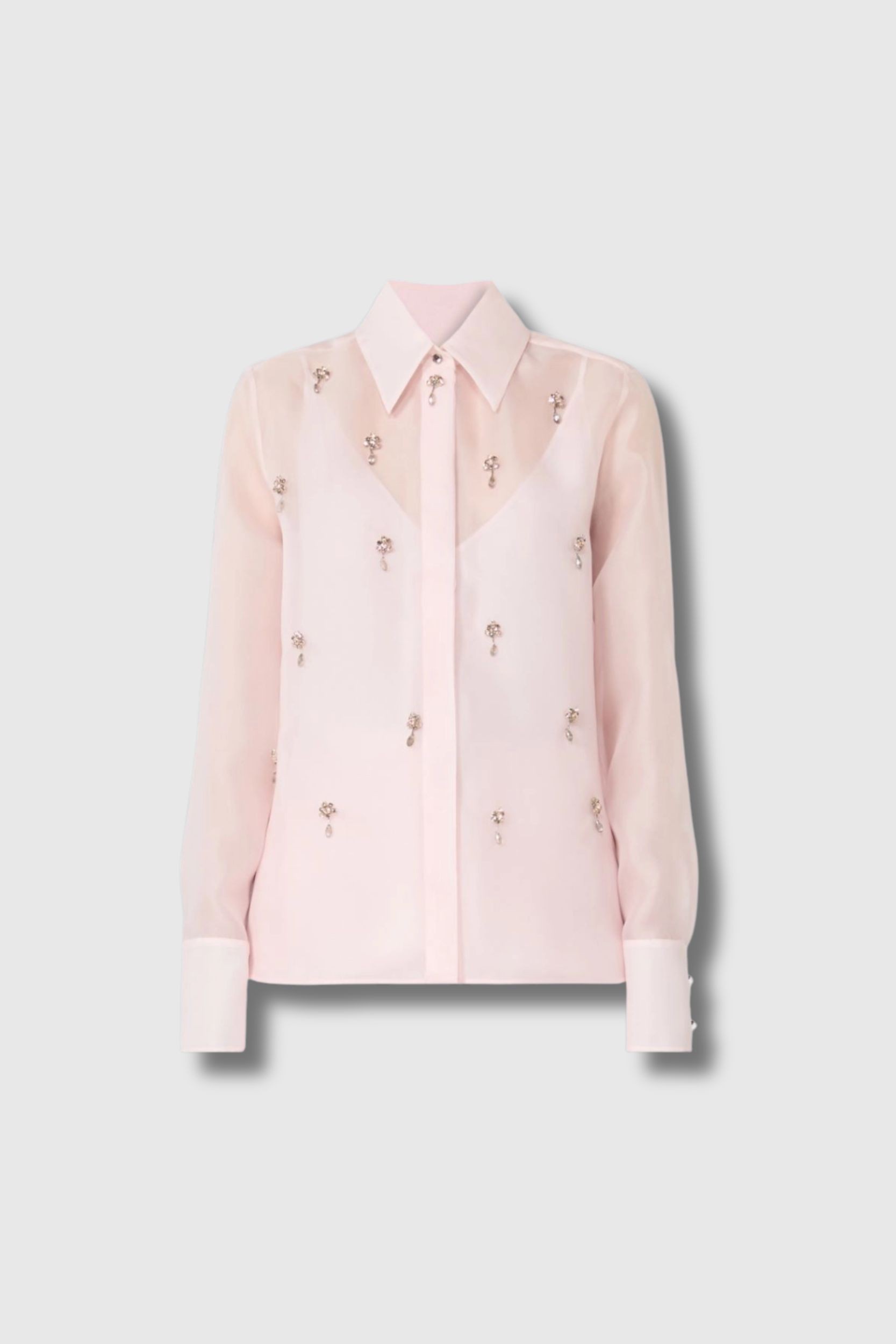 Cette chemise Agi bijoux en soie rose poudré signée Max Mara revisite l’allure masculine avec une élégance précieuse. Confectionnée en organza de pure soie, elle présente une coupe droite sublimée par de délicates broderies sur le devant. Le petit col et les poignets hauts sont ornés de boutons bijoux, apportant une touche raffinée. Dotée de manches longues montées, d’une fermeture invisible à boutons dissimulés et d’un bas arrondi avec fentes latérales, elle est accompagnée d’un fond de robe assorti à fines bretelles pour un porté tout en légèreté.