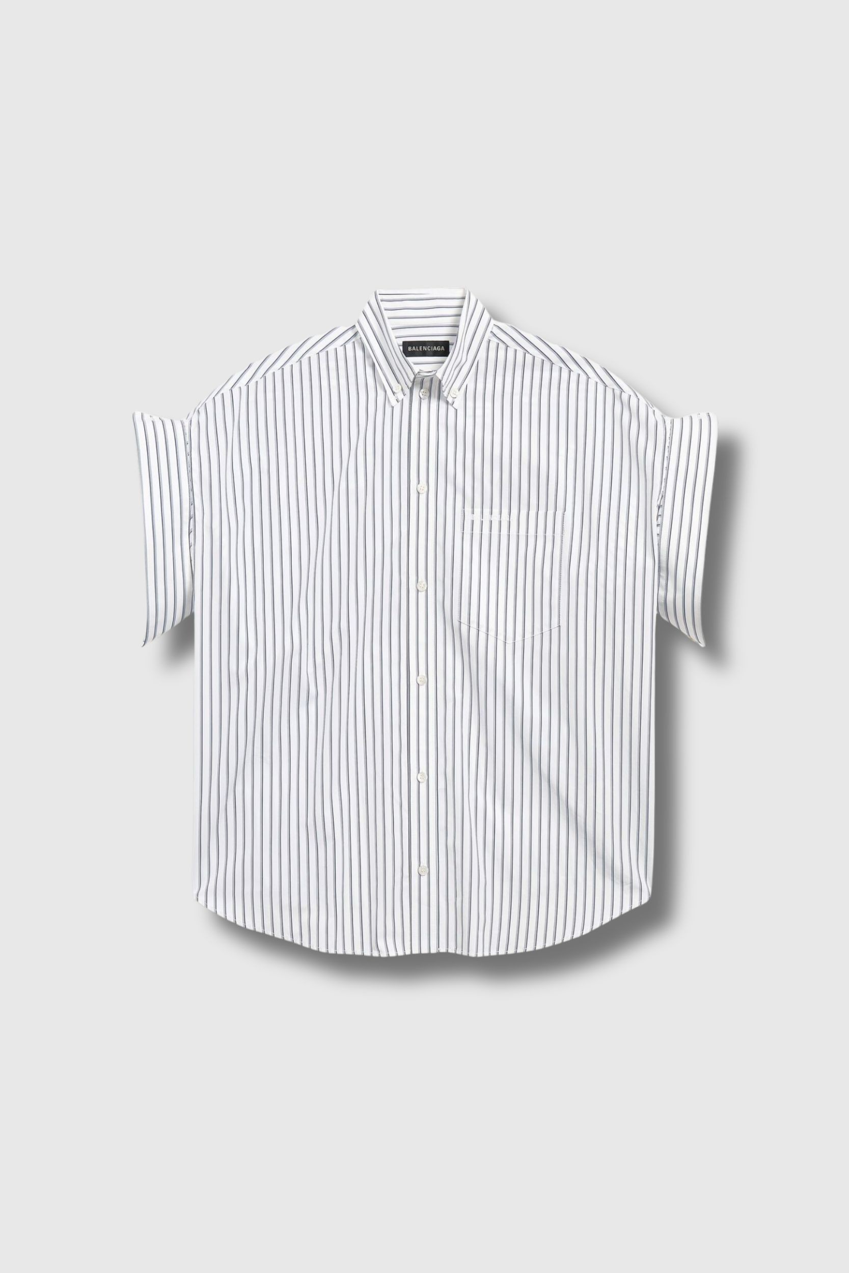 Cette chemise Tucked Sleeve rayée blanc et bleu signée Balenciaga revisite un classique du vestiaire masculin avec une touche contemporaine. Confectionnée en popeline rayée, elle présente une silhouette chemise structurée, un col boutonné et une fermeture à sept boutons gravés Balenciaga. Les manches courtes rentrées apportent un volume subtil et une allure moderne, tandis que la poche poitrine et le logo Balenciaga brodé soulignent l’identité de la Maison. Le bas arrondi parachève cette pièce à l’élégance décontractée et graphique.