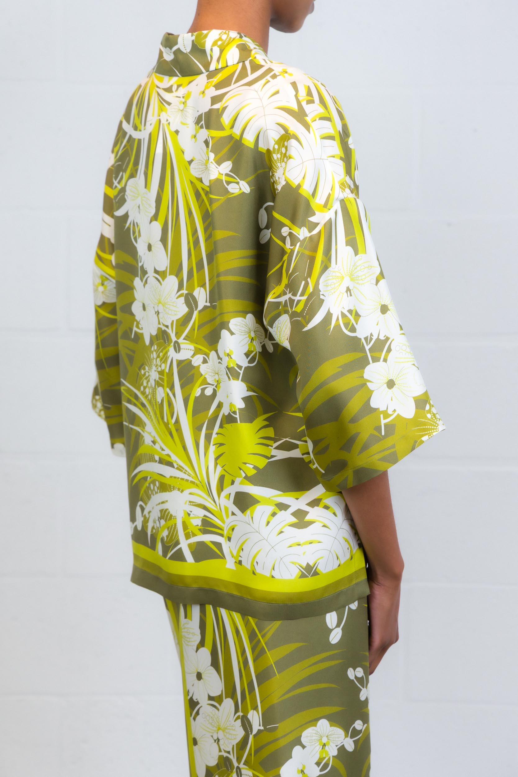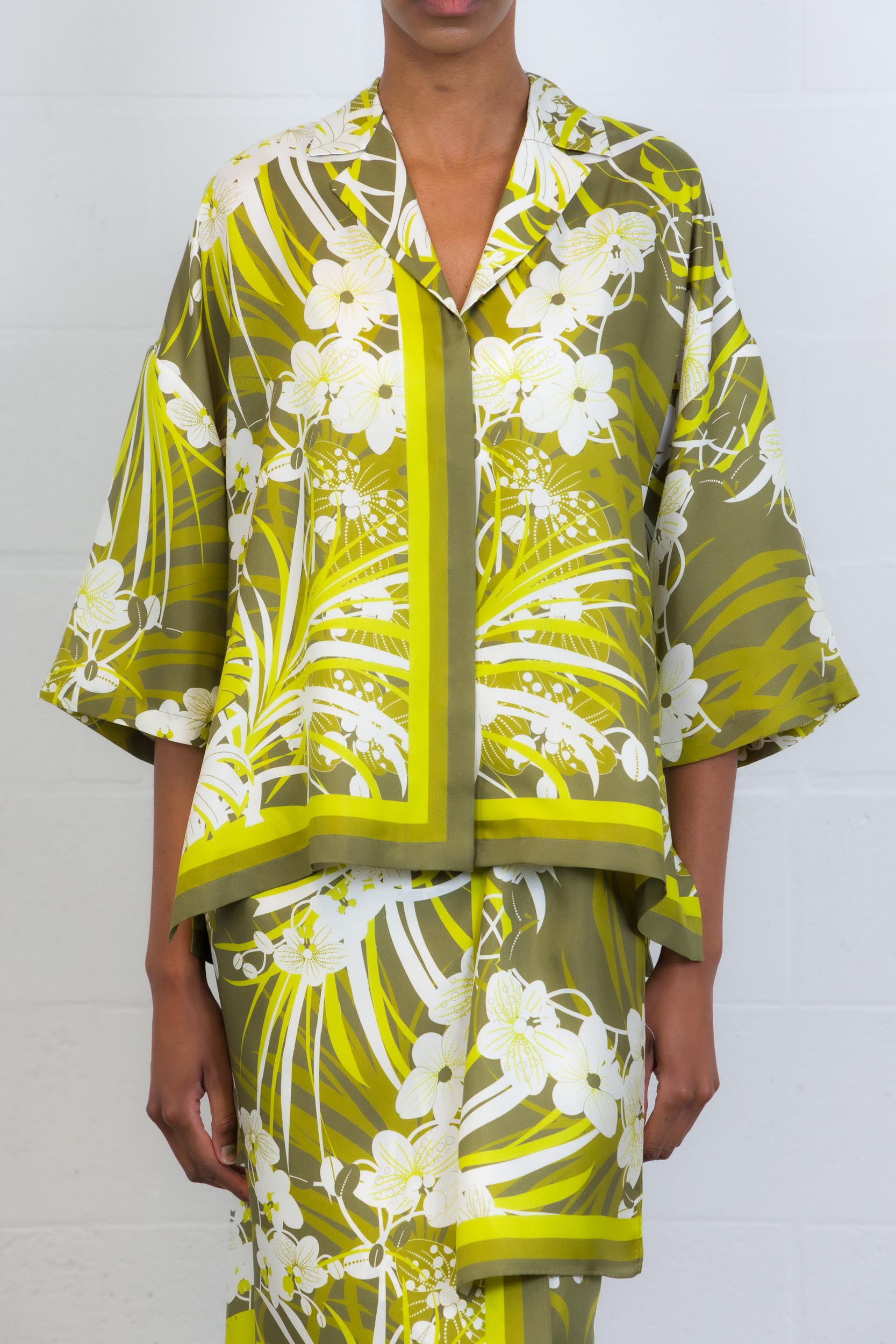 Cette chemise imprimée fleurs kakis est signée MaxMara. Celui-ci présente un petit col et des manches 3/4.