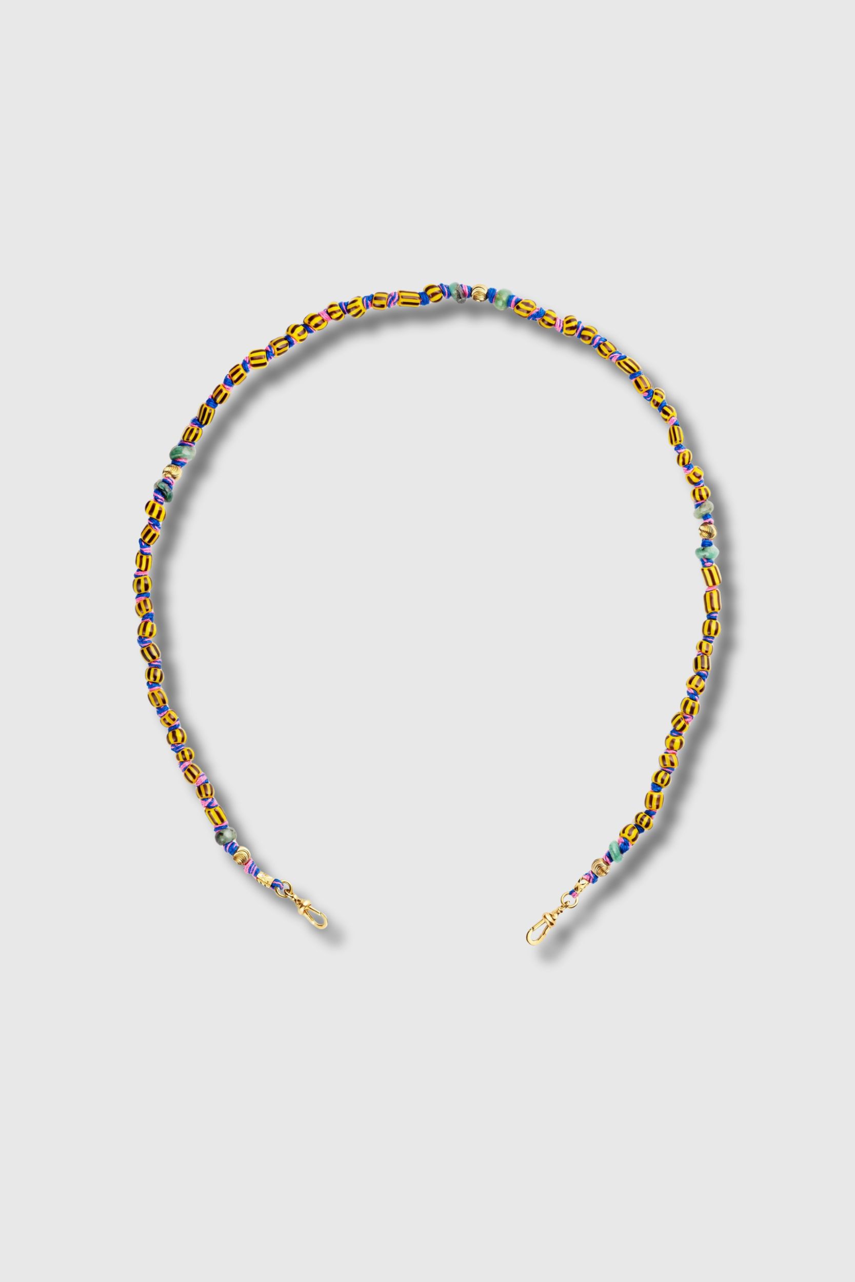 Ce collier Mauli Ghana jaune et noir 35 cm est signé Marie Lichtenberg. Réalisé à la main, il se compose de perles de verre, de perles en or serties de diamants et de perles d’émeraude, mêlant savoir-faire artisanal et raffinement contemporain. Fermoirs menottes en or jaune 9 carats à chaque extrémité.