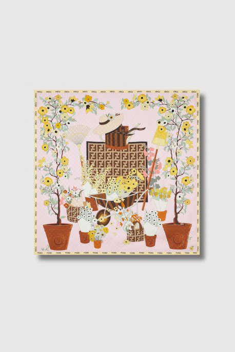 Ce foulard imprimé en soie rose est signé Fendi. Ce carré en soie revisite l’archive avec l’imprimé Fendi Gardening, mêlant motifs floraux historiques et détails ludiques comme des escargots Pequin et des paniers FF. La base jacquard micro FF enrichit la texture, tandis que le liseré jaune color block avec logo et les bords roulottés à la main apportent une finition raffinée.