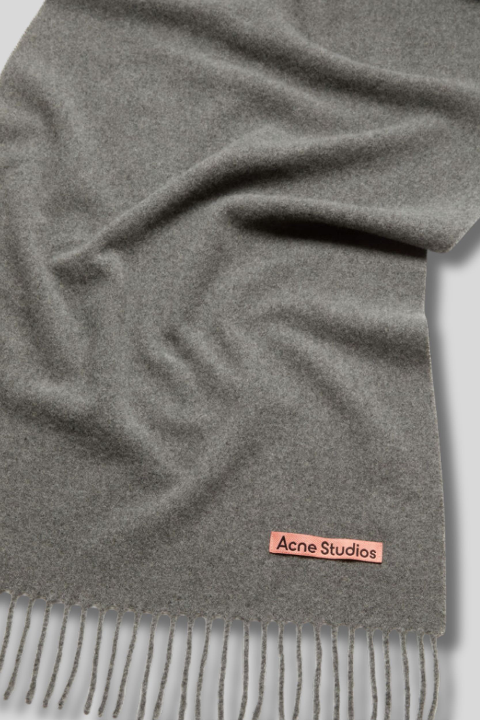 Cette écharpe grise signée Acne Studios se distingue par ses franges et son cachemire semi-épais. Le logo de la marque est cousu sur une étiquette rose.