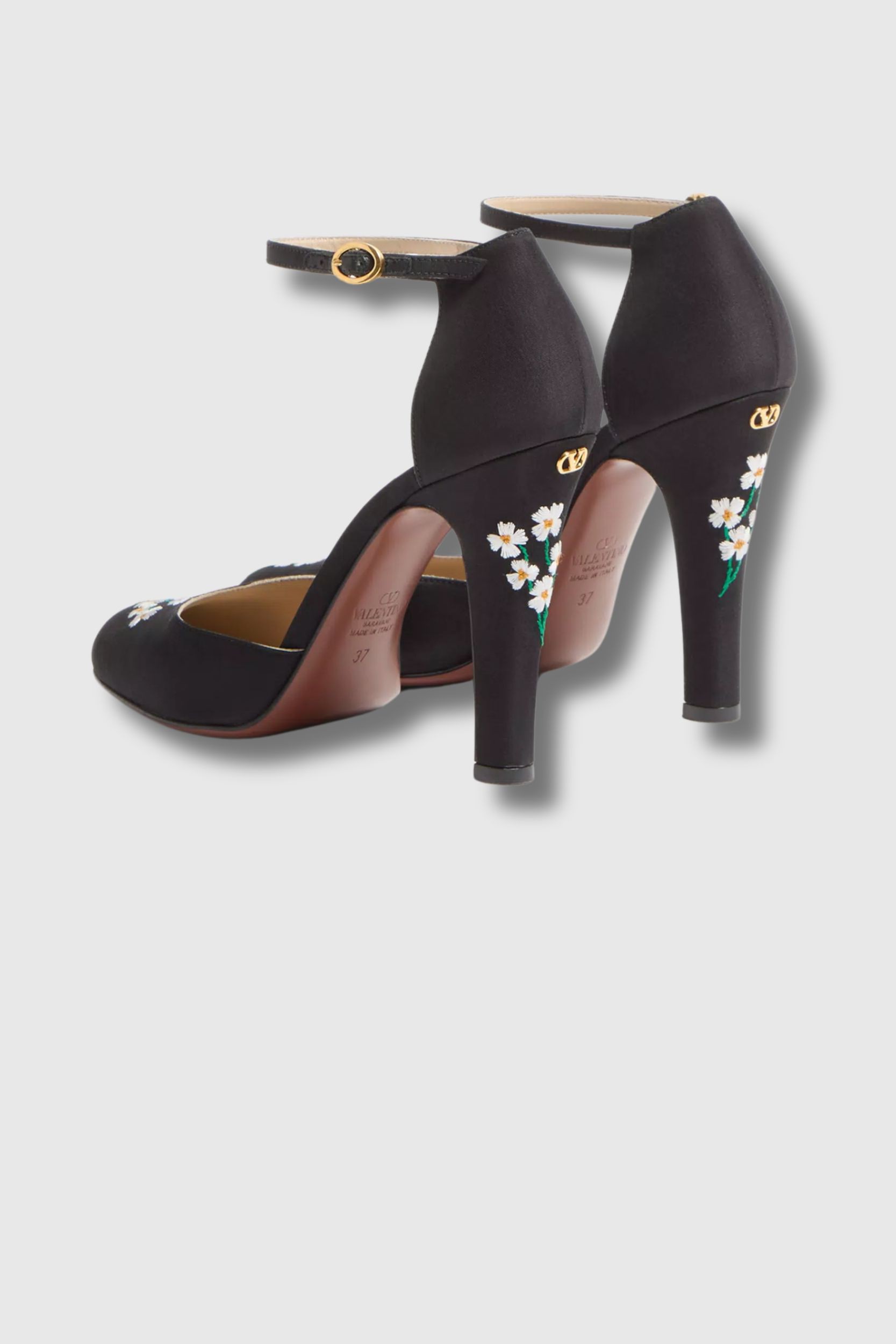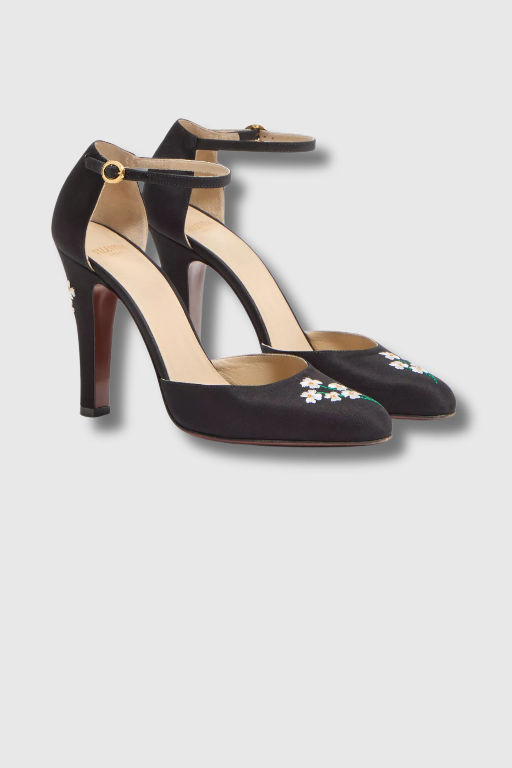 Ces escarpins Hi Dolly en tissu noir bordé floral sont signés Valentino Garavani. Ceux-ci présentent une broderie sur la tige et le talon, une bride à la cheville réglable et un talon de 105mm.