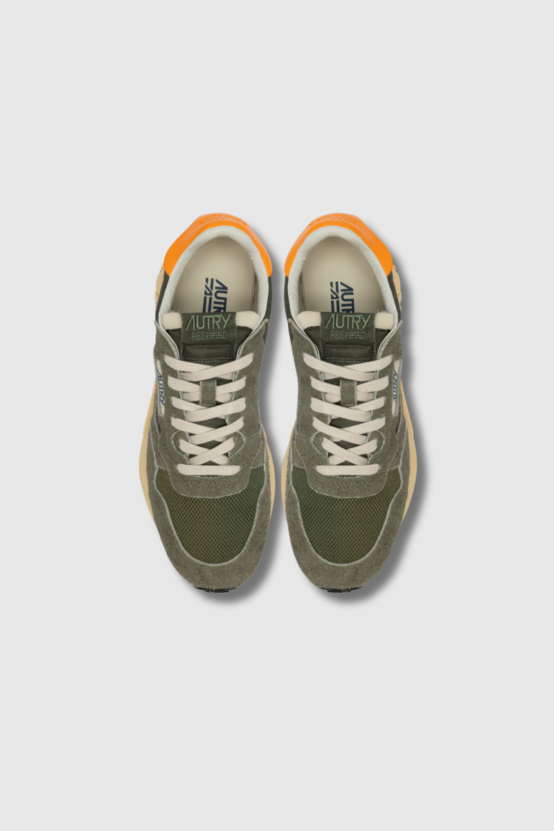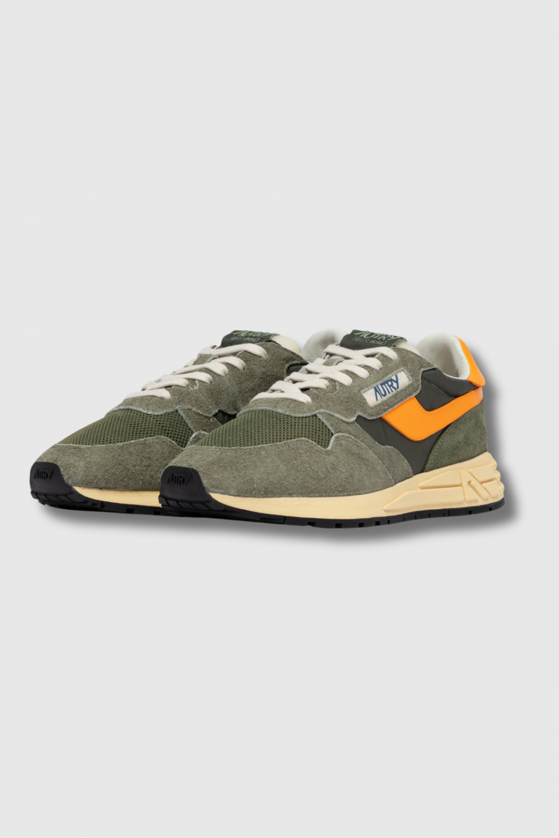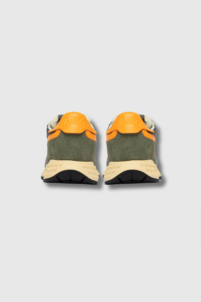 Ces baskets Reelwind orange & kaki sont signées Autry. Leur design associe du daim kaki, rehaussé d’un patch en cuir orange sur les côtés. Leur silhouette raffinée et leur construction technique offrent une liberté de mouvement optimale. La semelle en caoutchouc, dotée d’une bande de roulement en relief, arbore la flèche A, une interprétation graphique et moderne du logo de la marque.