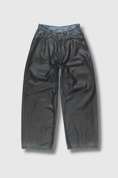 Ce jeans en denim finition cuir noir signé Acne Studios est confectionné en denim Tencel indigo délavé et présente une finition en cuir noir pressé, offrant un rendu moderne et affirmé. Il adopte la coupe emblématique 2023 de la maison, avec une silhouette ample et super baggy, une taille basse et une longueur rallongée. Doté d’une construction classique à cinq poches et d’une braguette à boutons, il combine inspiration workwear et esthétique contemporaine.