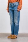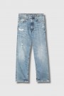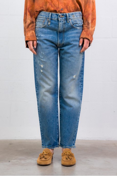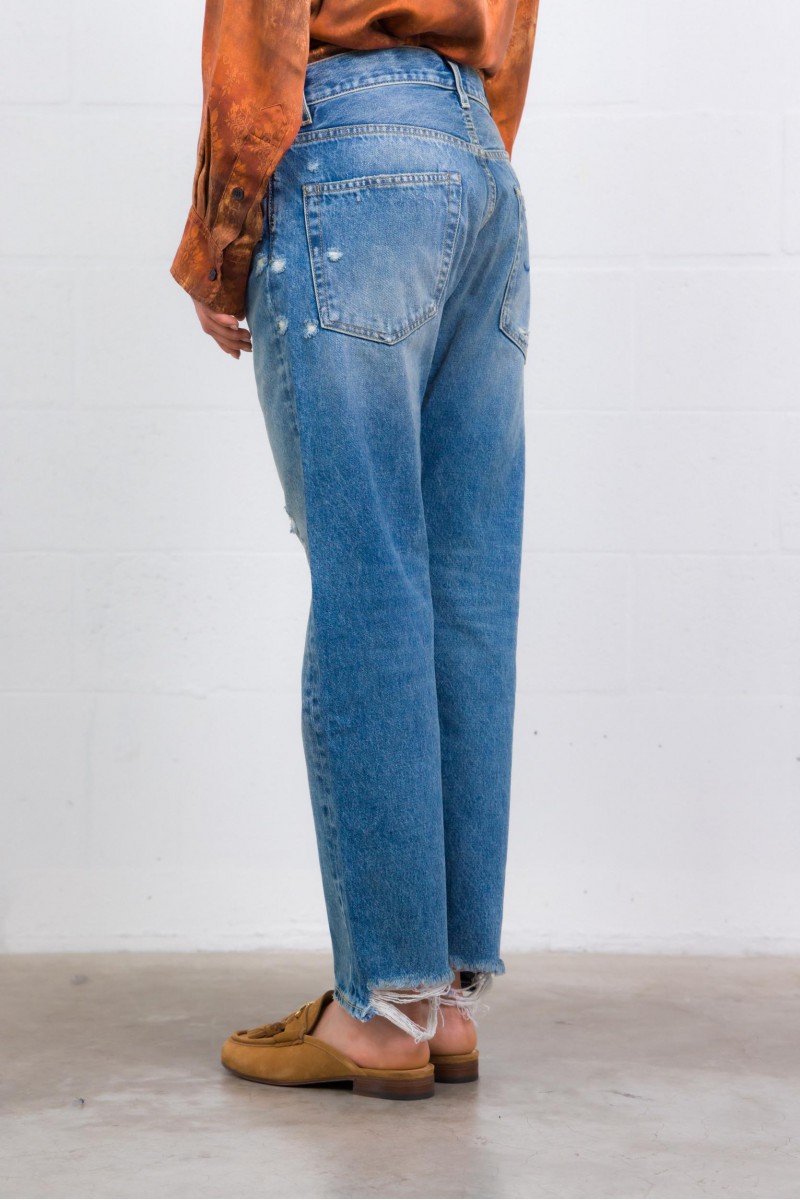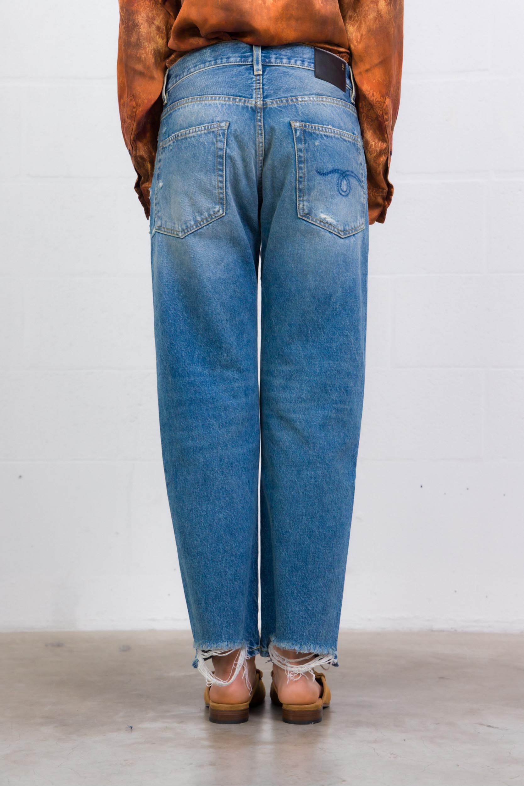Ce jean Boyfriend Bain/Rips bleu signé R13 incarne l’esthétique rock et décontractée de la marque. Confectionné en denim très souple, il se distingue par ses détails volontairement usés et déchirés qui lui donnent un caractère authentique. Sa coupe boyfriend assure une allure relaxed, tandis que les coutures en fils ocres, les rivets et boutons en bronze vieilli renforcent son esprit vintage. Le bas de jambe déchiré à l’arrière accentue l’effet destroyed. Une pièce forte, idéale pour un look casual affirmé.
