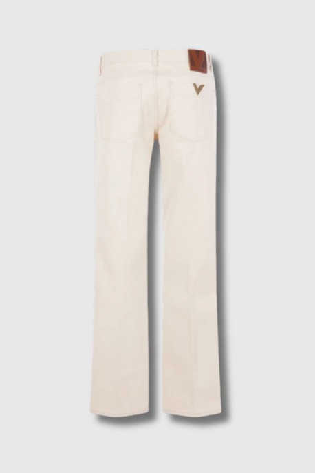 Ce jean en denim écru signé Valentino Garavani incarne une élégance décontractée à l’allure couture. Confectionné en denim de coton ivoire, il présente une taille basse et une jambe large qui dessinent une silhouette moderne et affirmée.