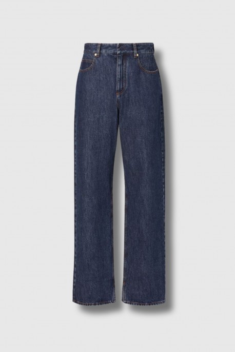 Le jeans FF bleu denim signé Fendi revisite le denim classique avec une élégance contemporaine. Ce pantalon cinq poches à taille haute adopte une coupe large et droite pour une silhouette structurée. Confectionné en denim bleu foncé, il se distingue par un motif FF matelassé sur la poche droite et à l’arrière, des surpiqûres contrastées ainsi que des rivets métalliques finition palladium, signature raffinée de la Maison.