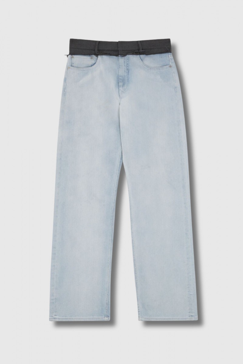 Le Jeans avec taille pantalon signé MM6 Maison Margiela revisite le denim avec audace. Confectionné en denim délavé clair, il se distingue par une taille ajustée en laine à coupe brute, créant un contraste structuré et déstructuré. Sa silhouette droite et décontractée modernise les codes traditionnels du jean. À l’arrière, la ligne de surpiqûres blanches MM6 signe discrètement son identité avant-gardiste.