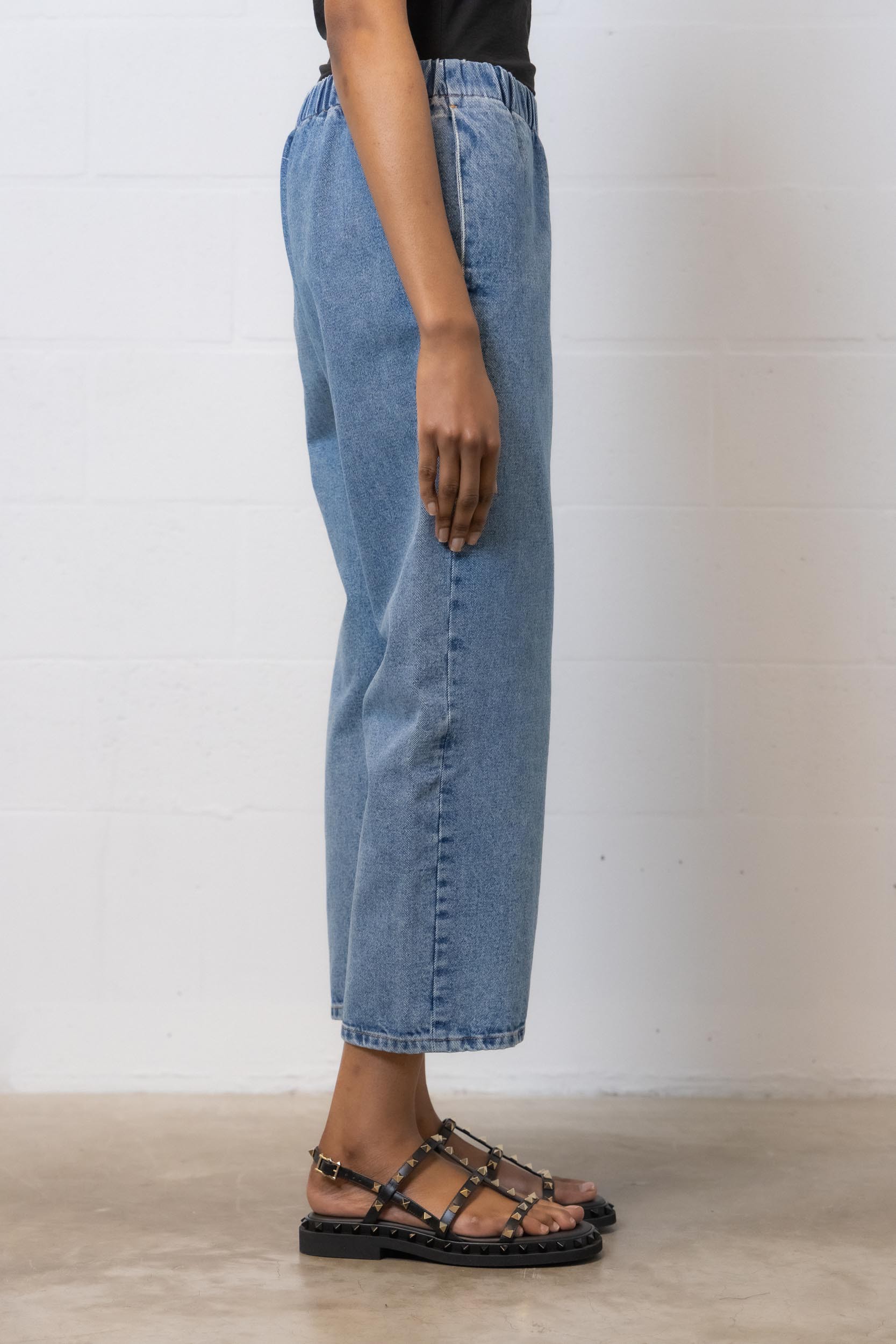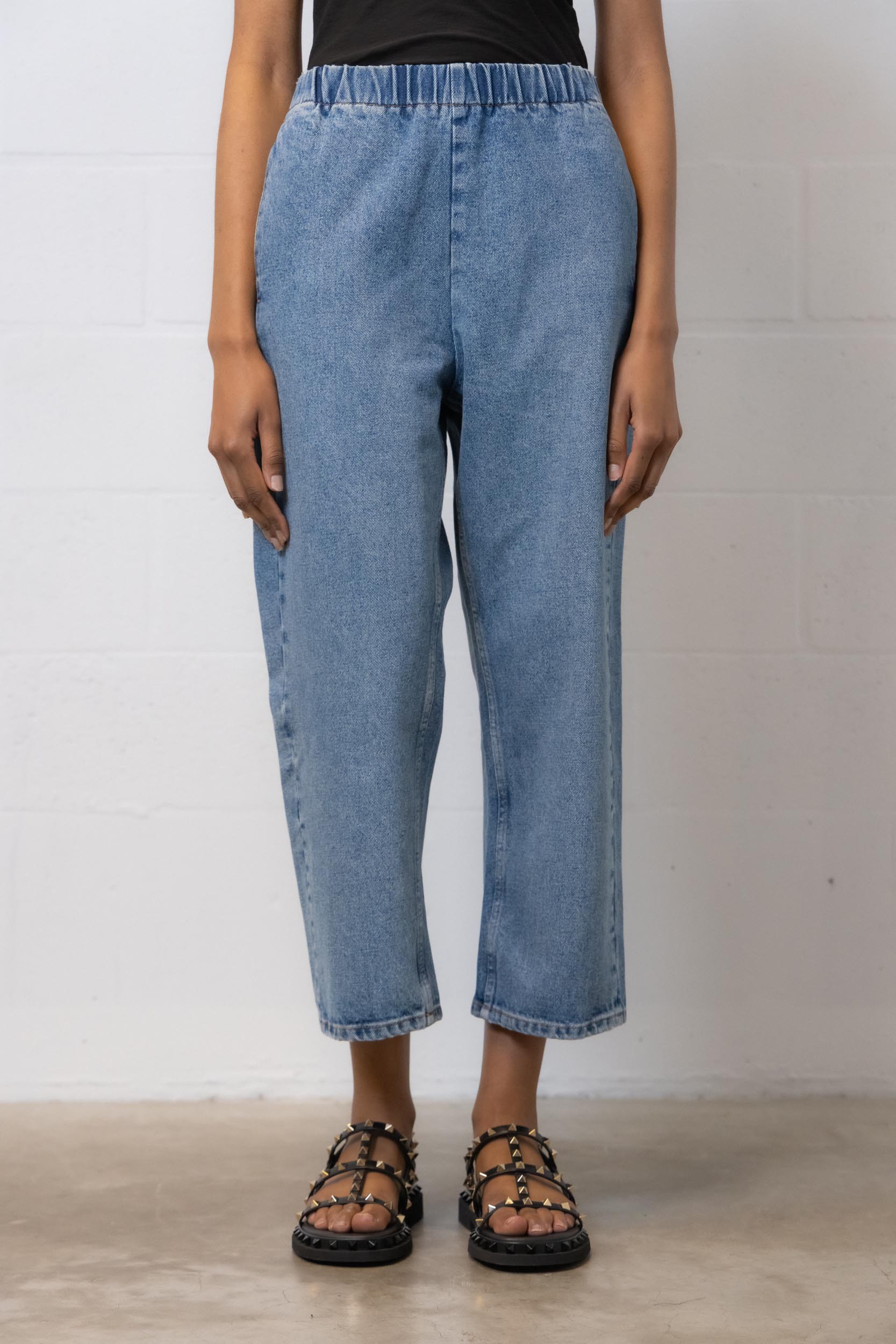 Ce jean bleu en coton est signé MM6. Il est confectionné dans un mélange de coton et est équipé de poches latérales. Arborant une coupe droite avec une taille élastiquée, l'arrière est agrémenté d'une ligne horizontale de surpiqûres blanches, une signature de la marque à la fois discrète et élégante.
