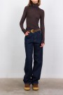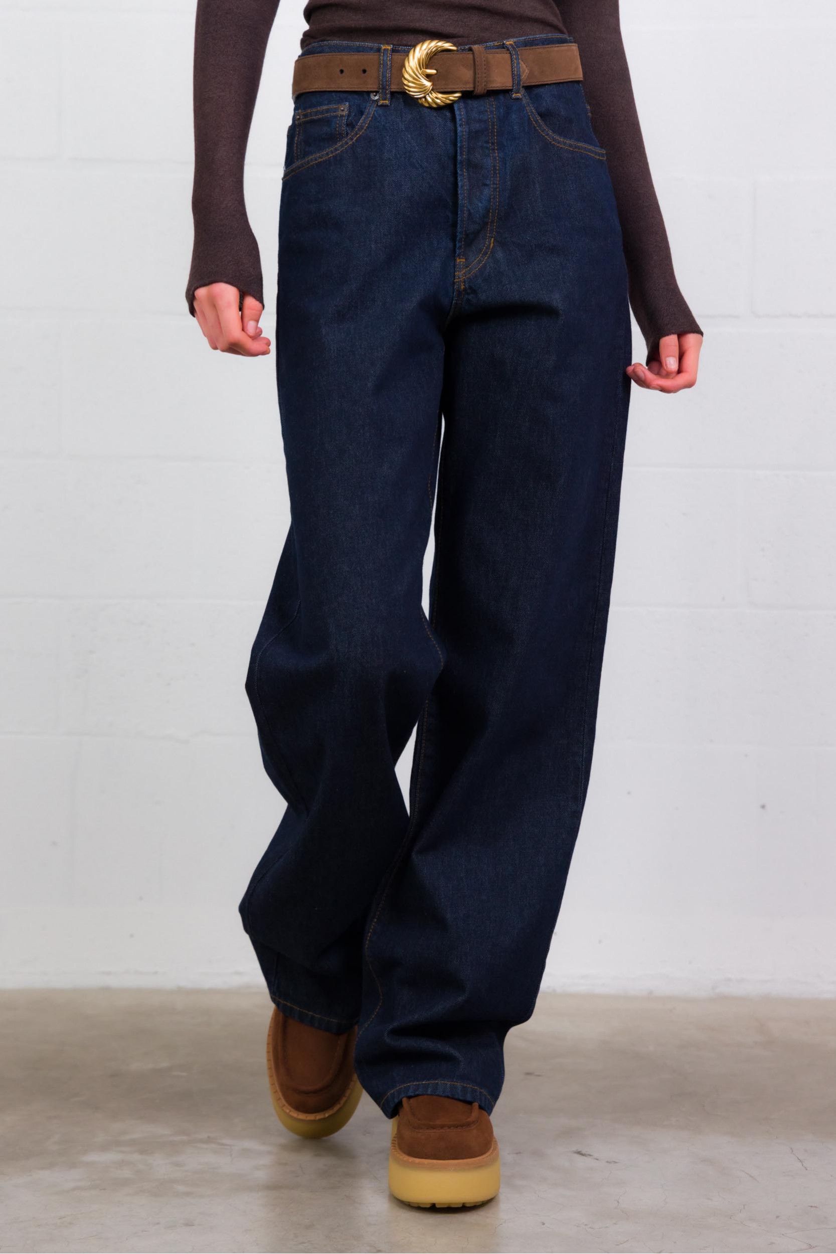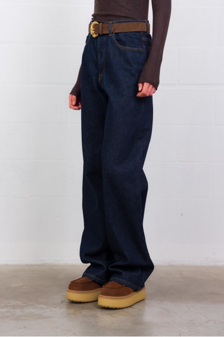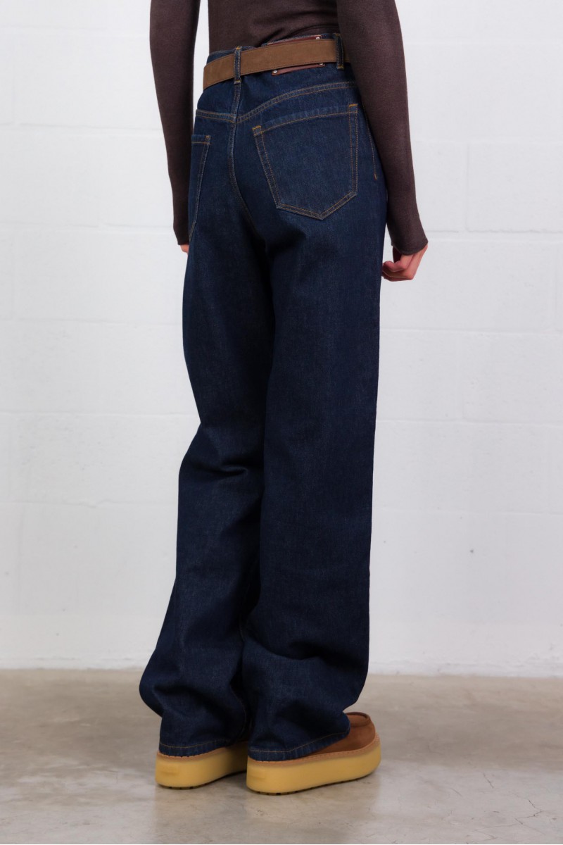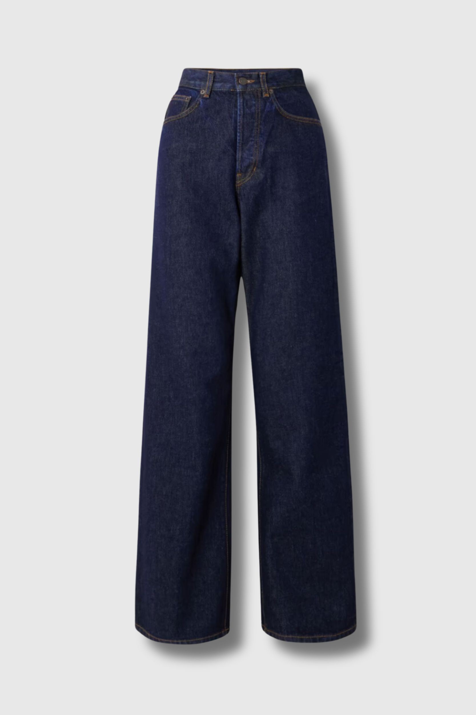 Ce jean en denim bleu foncé est signé Dries Van Noten. Il présente une coupe taille haute avec des jambes larges.