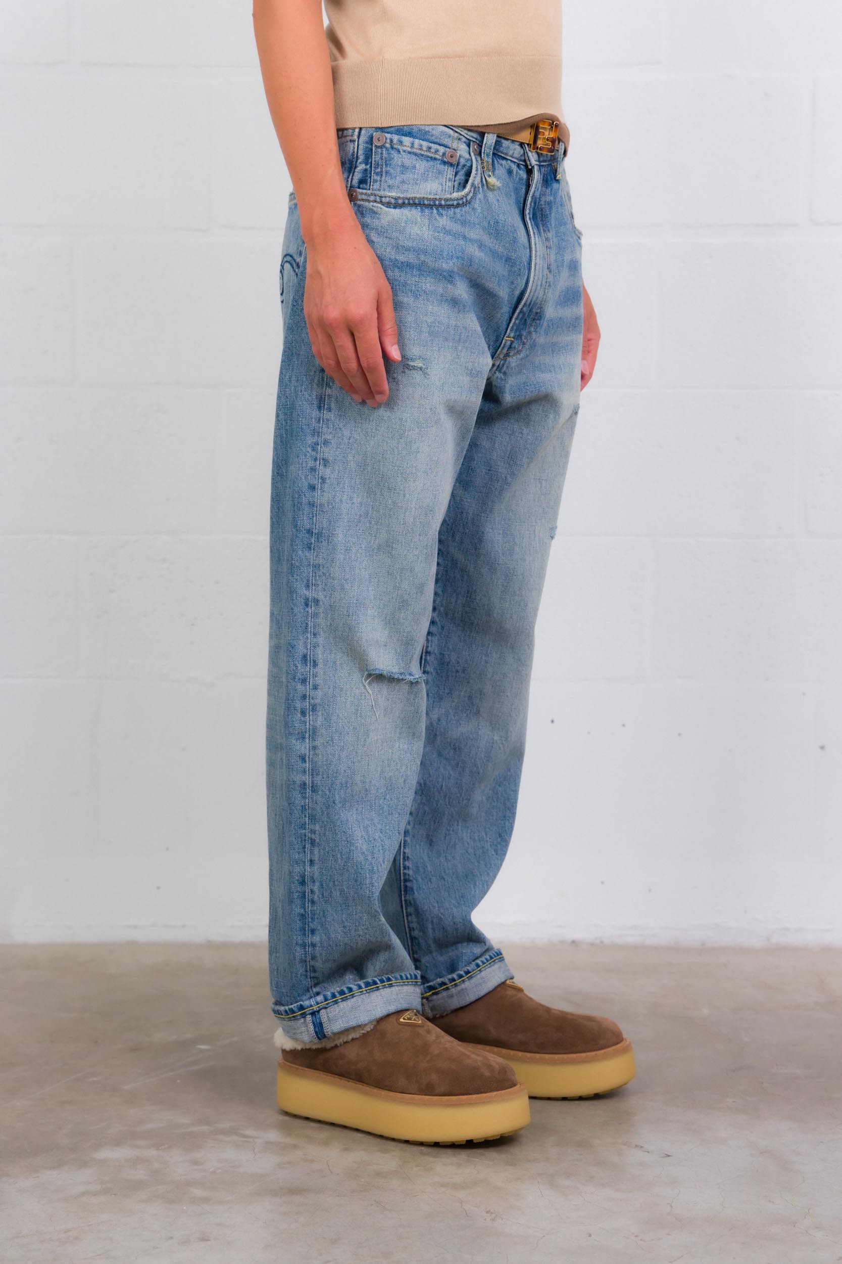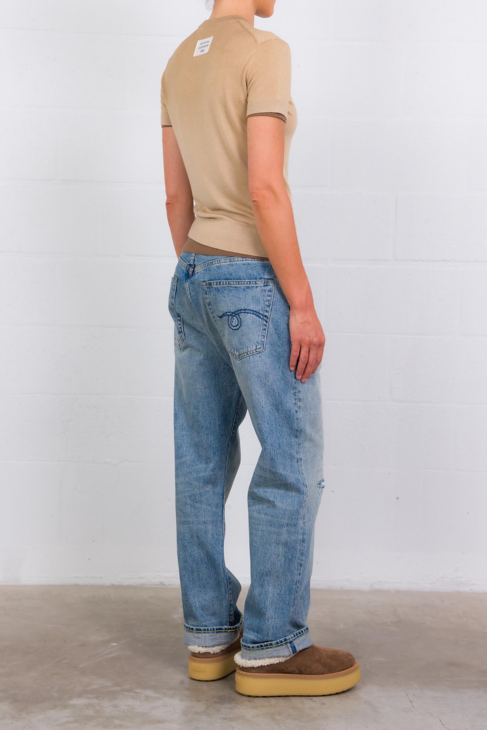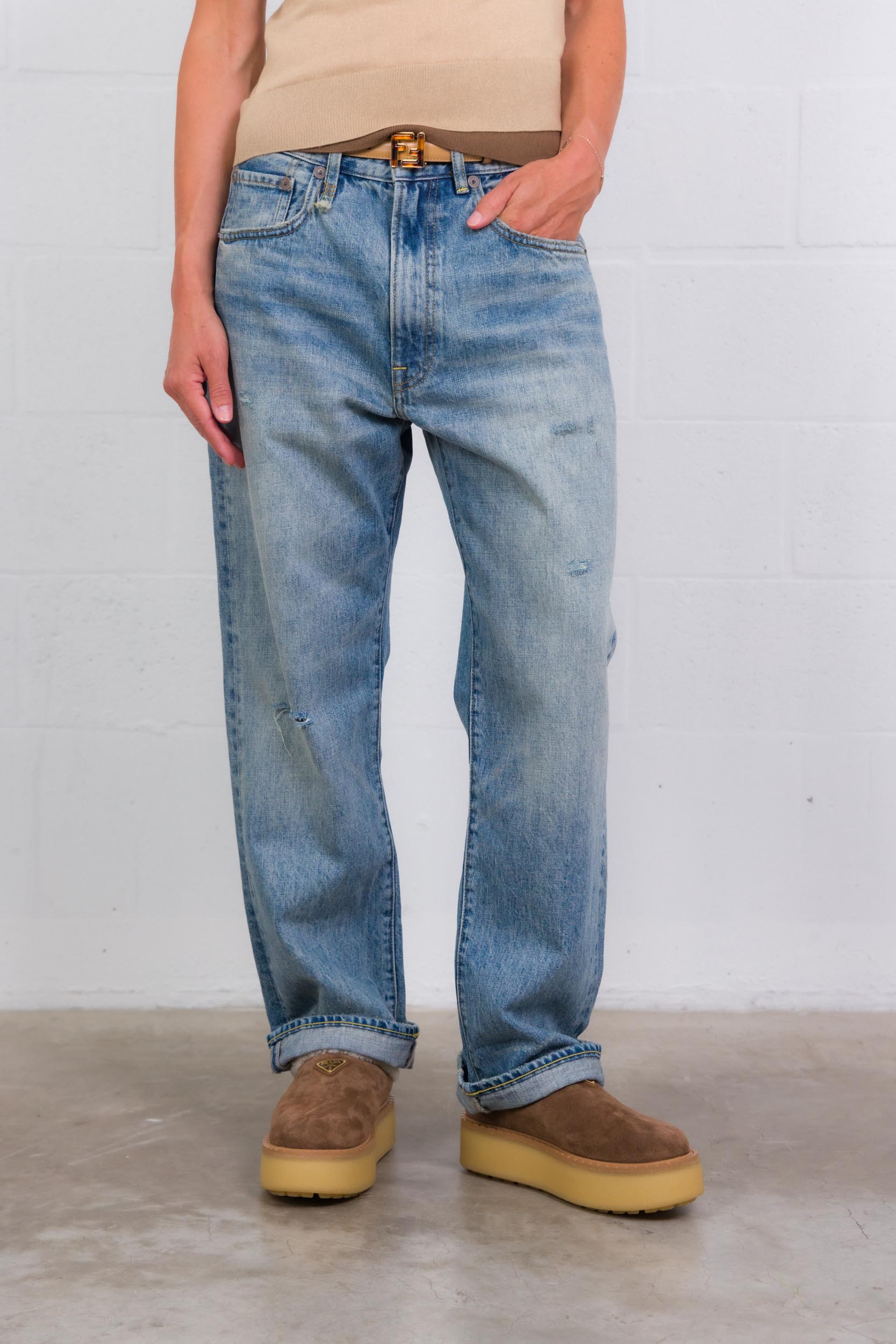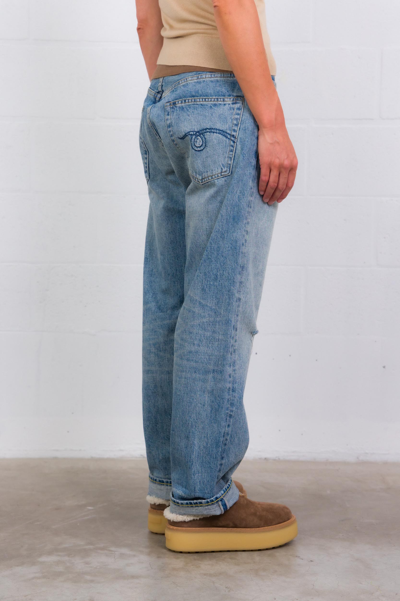 Ce jeans X-Boyfriend en bleu Lena est signé R13. Celui-ci présente des ourlets en bas et se porte taille mi-haute. Coupe ample.