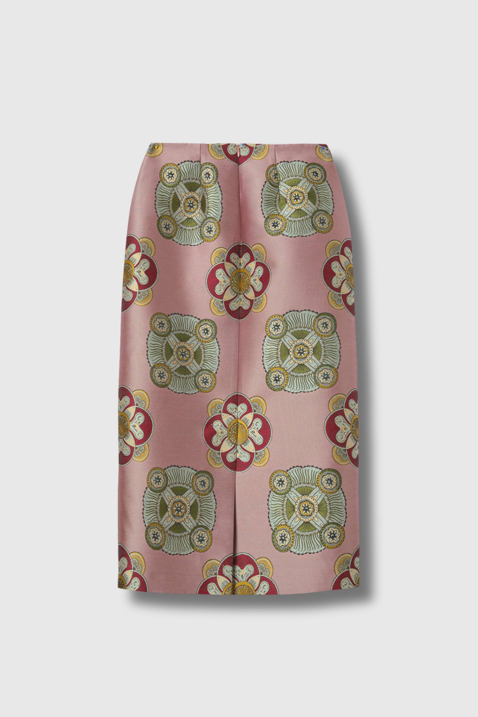 Cette jupe en jacquard de soie rose est signée La Double J. Elle se distingue par ses motifs imprimés, qui lui confèrent une allure à la fois élégante et décontractée.