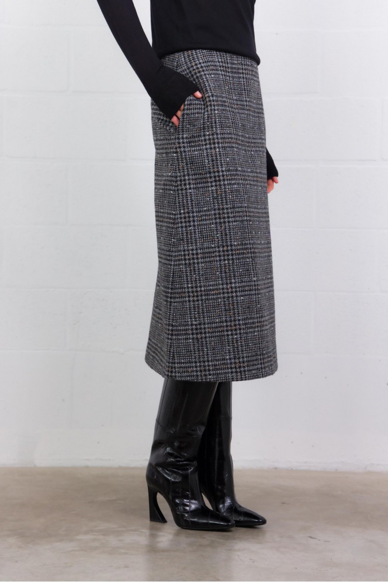 Cette jupe midi en Prince-de-Galles est signée Fendi. Confectionnée en tweed de laine mélangée, elle se distingue par son motif gris dégradé au charme intemporel. Sa coupe évasée et sa taille regular offrent une allure élégante et féminine, tandis que les poches latérales ajoutent une touche pratique. Fermée par un zip discret, elle incarne le parfait équilibre entre modernité et sophistication.