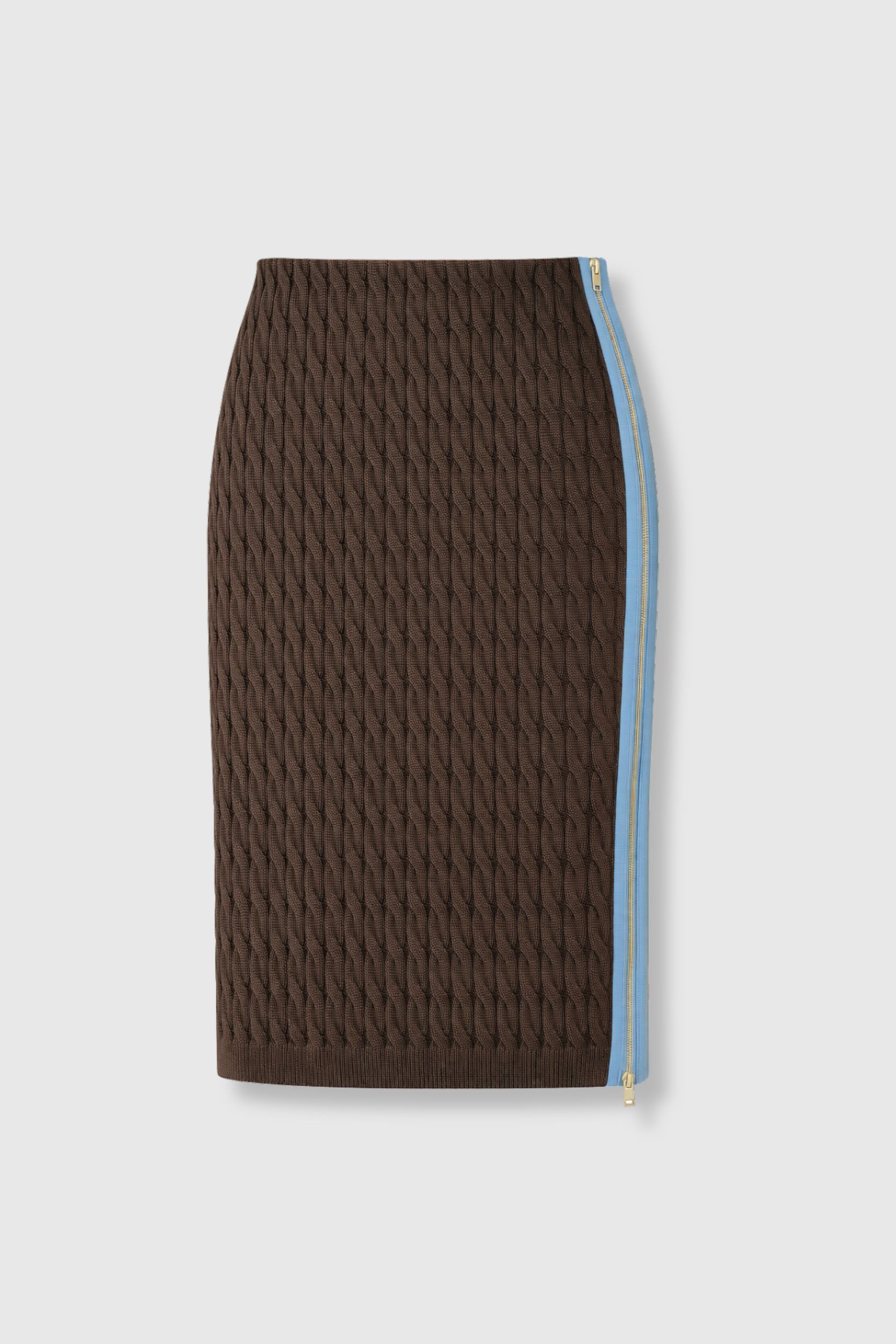 Cette jupe signée Fendi prolonge avec justesse l’esthétique du cardigan assorti, dans une riche teinte marron à la profondeur subtile. Confectionnée dans une maille luxueuse à la texture veloutée, elle épouse la silhouette avec élégance tout en offrant un confort absolu.