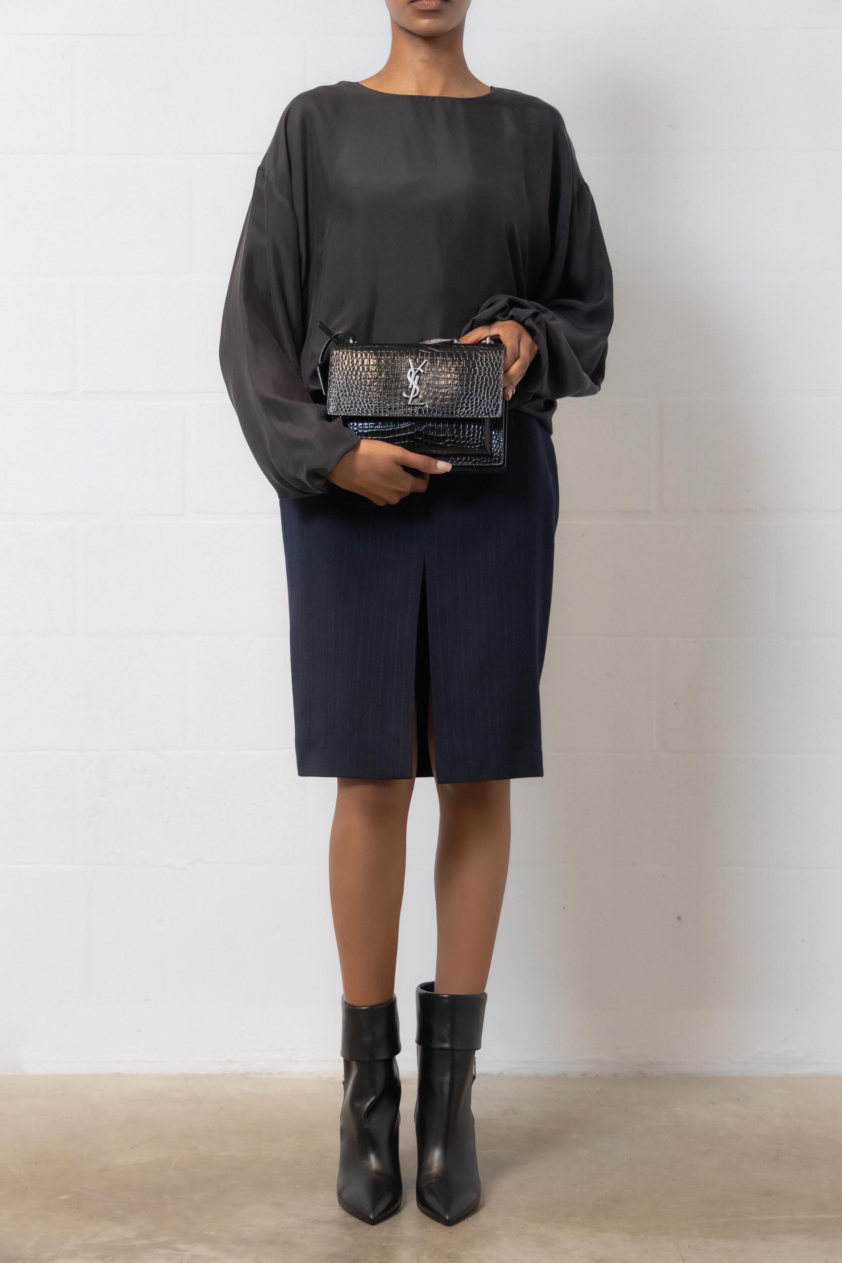 Cette jupe crayon en laine responsable bleu marine est signée Saint Laurent. Elle présente une coupe crayon et est dotée d'une fente et des poches dissimulées sur le devant.