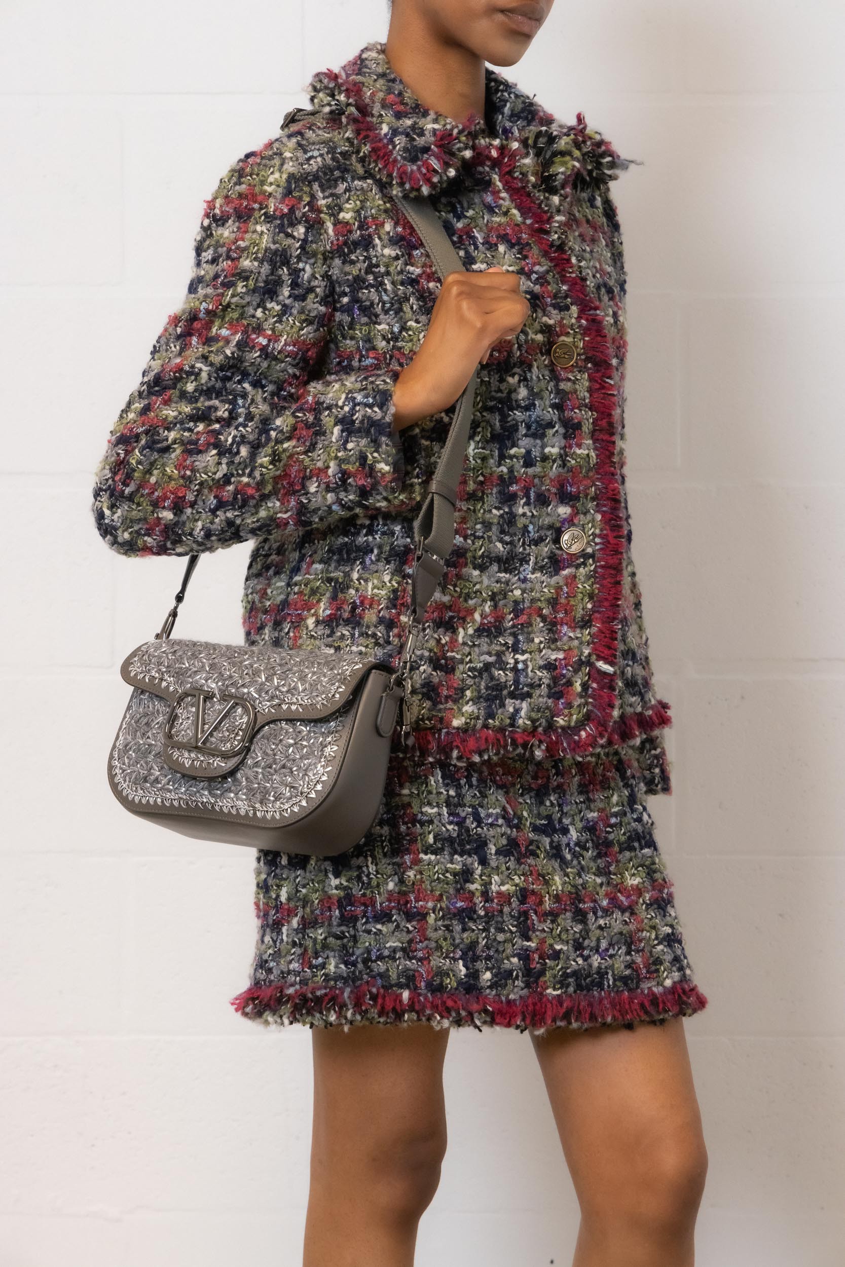 Cette mini jupe en tweed vert, rose et gris est signée Etro. Celle-ci s'enfile grâce à une fermeture éclair au dos et possède une coupe droite.