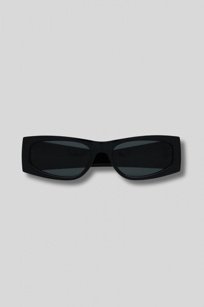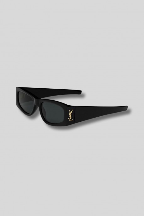 Ces lunettes de soleil rectangulaires noires sont signées Saint Laurent. Elles présentent une monture en acétate épais et des verres en nylon, avec des branches larges. Elles sont dotées du logo Cassandre au niveau des branches.