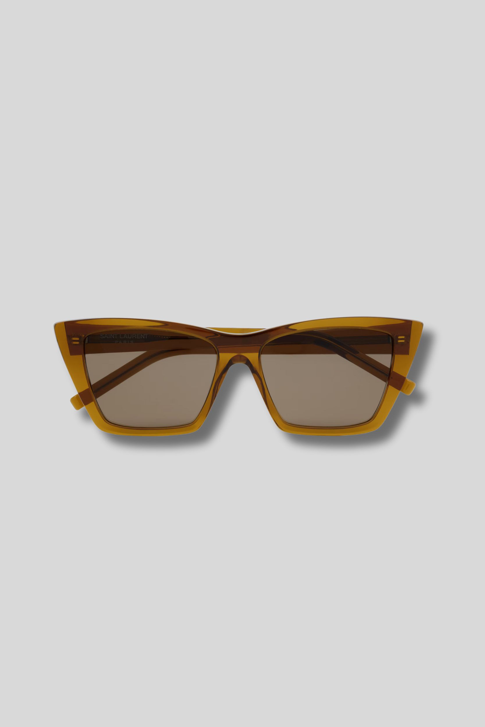 Ces lunettes de soleil œil-de-chat avec monture en acétate et verres en nylon marron sont signées Saint Laurent. Elles présentent des branches gravées du logo Saint Laurent et offrent une protection 100 % UVA/UVB. La monture est compatible avec des verres correcteurs.