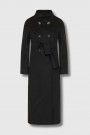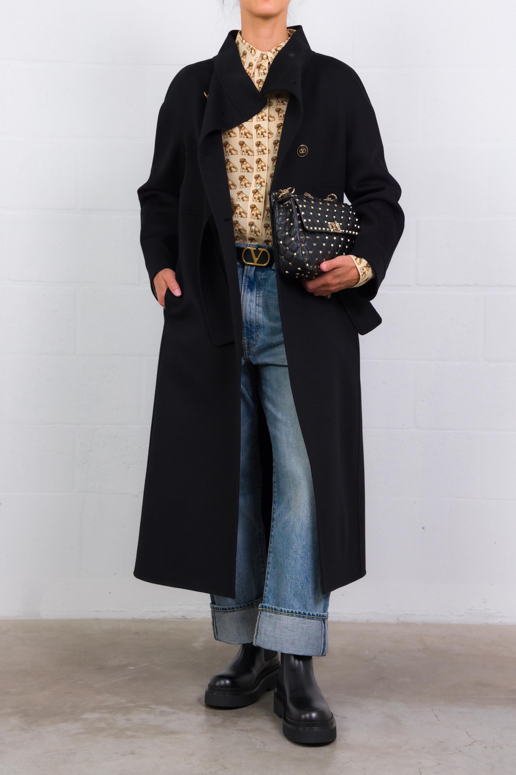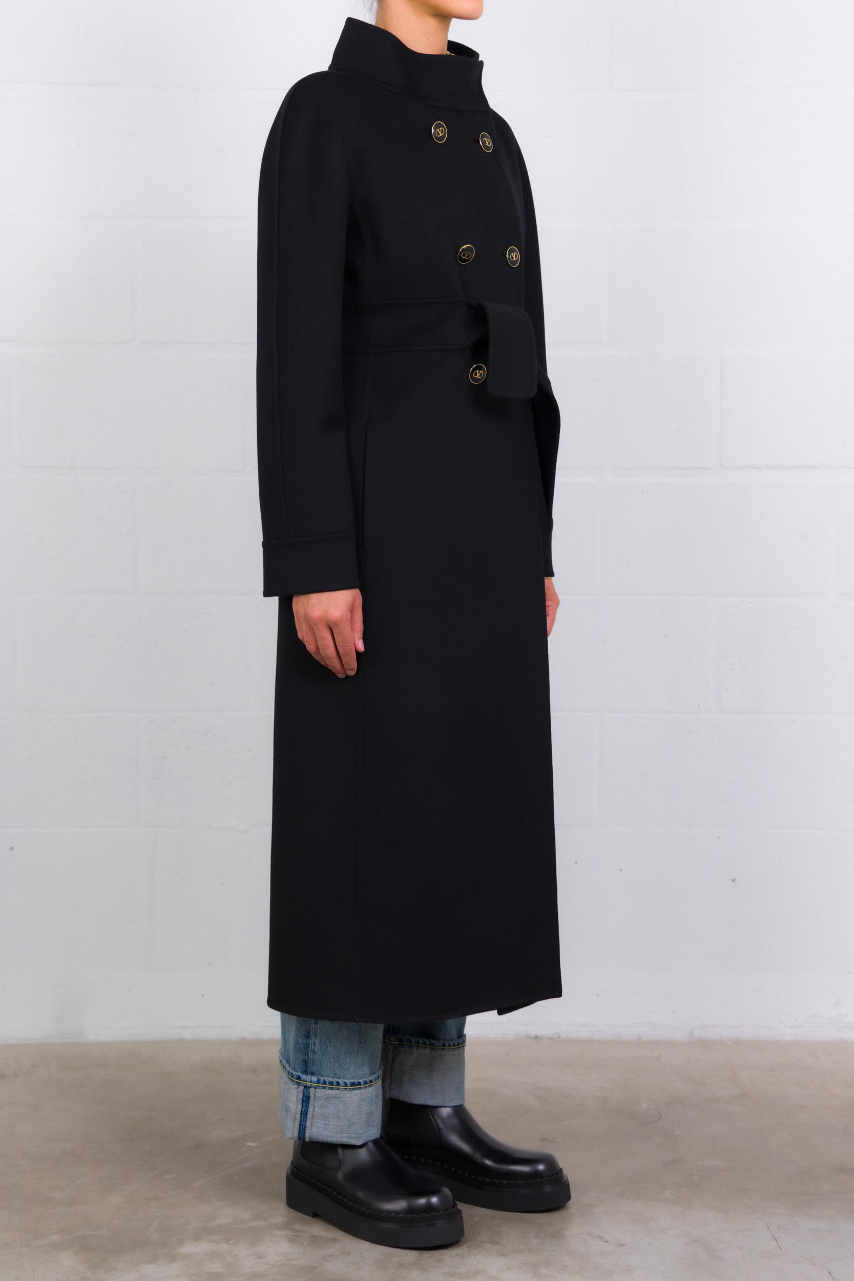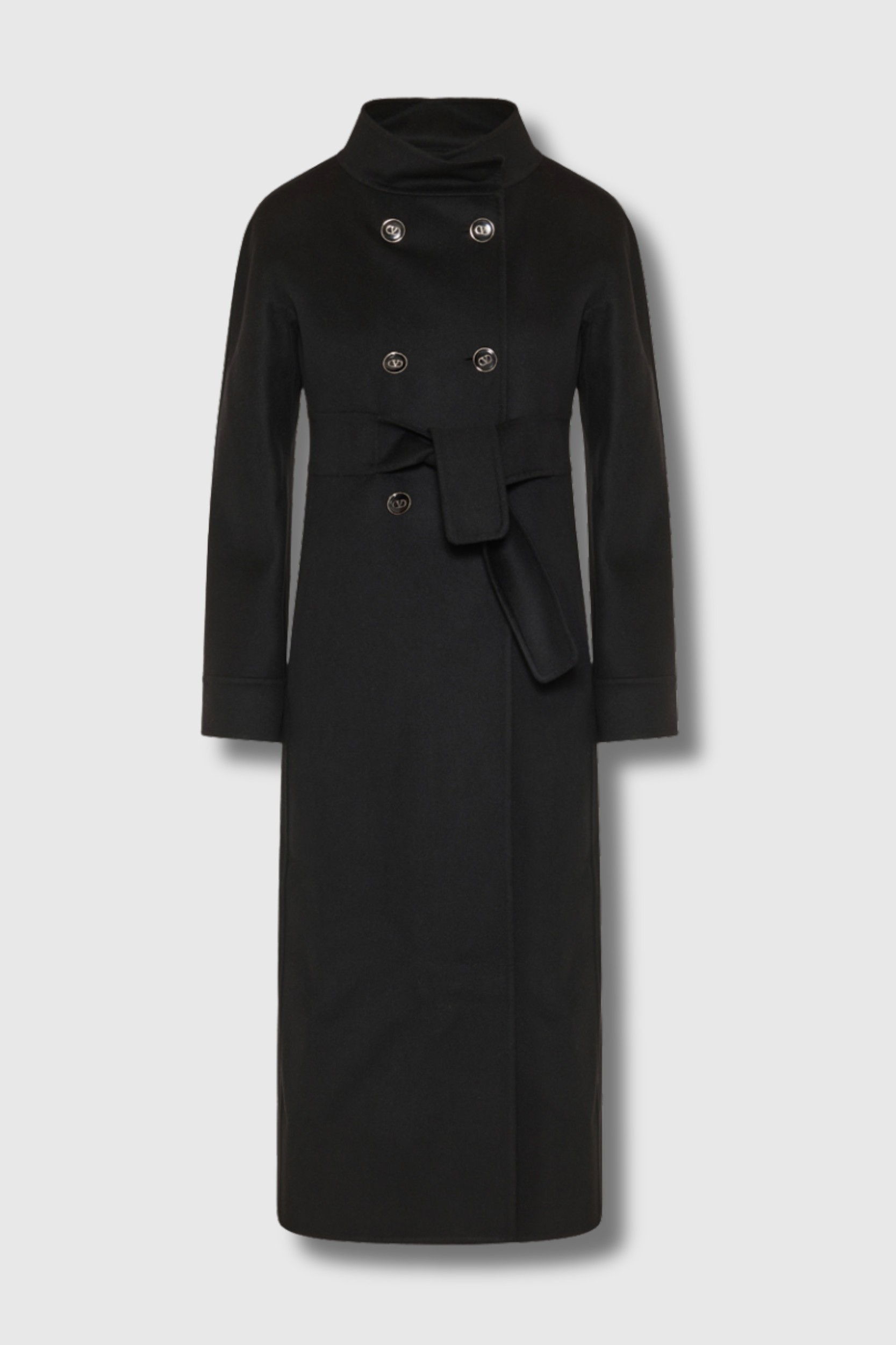Ce manteau noir en drap compact signé Valentino Garavani séduit par son élégance intemporelle. Doté d’un col montant et d’une fermeture croisée à double boutonnage, il est accompagné d’une ceinture permettant de souligner la taille. Sa coupe droite lui confère une allure à la fois structurée et féminine.