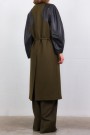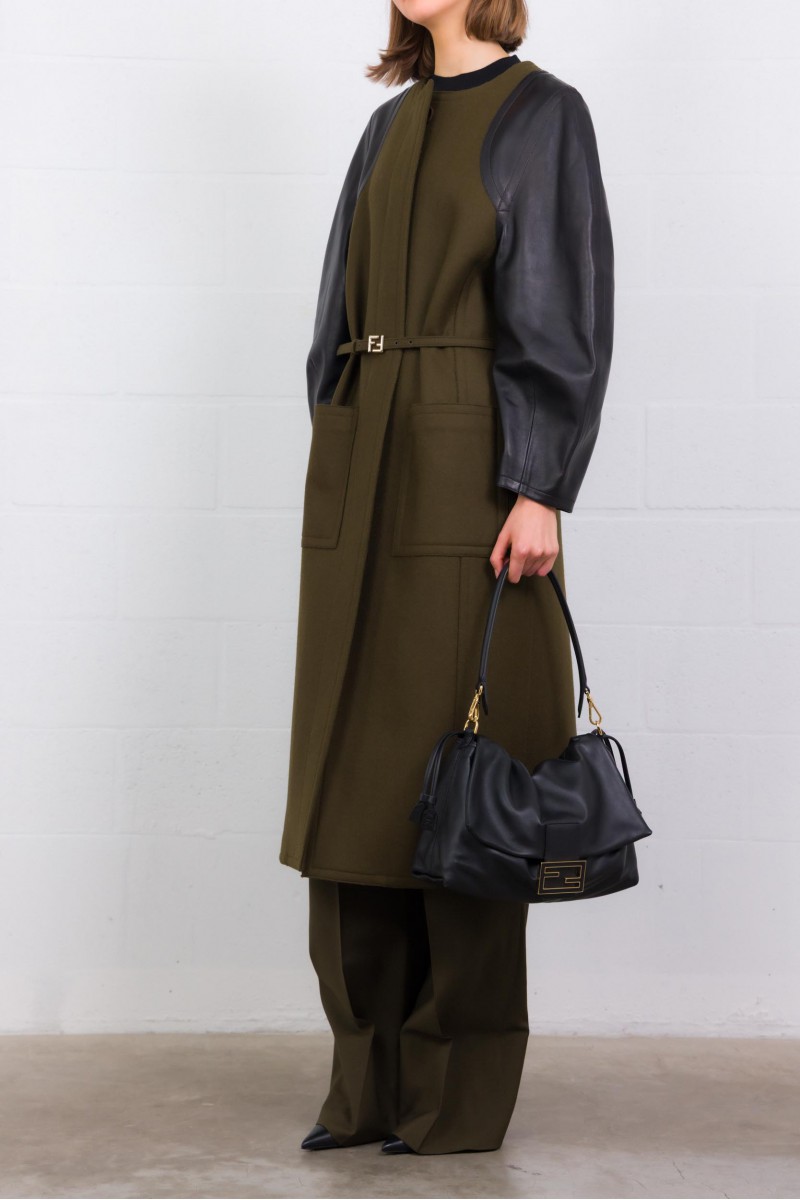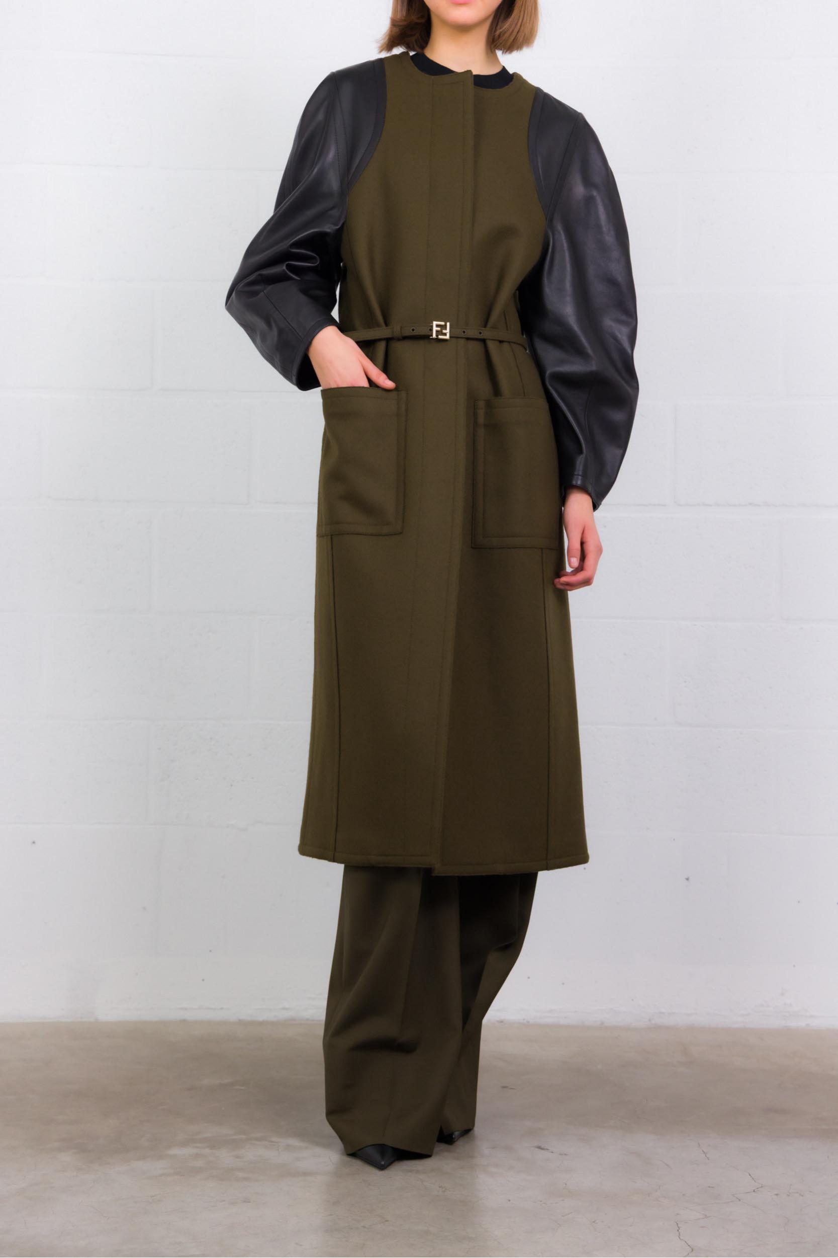 Ce manteau Fendi en laine et cuir associe l’élégance intemporelle au design contemporain. Confectionné en feutre de laine vert olive, il se distingue par sa coupe cocoon mi-longue au col rond raffiné et aux manches larges et fluides. Les manches en cuir nappa souple et les poches appliquées apportent une touche de contraste sophistiquée. Sa fermeture dissimulée souligne une ligne épurée et moderne, fidèle au style emblématique de la maison Fendi.