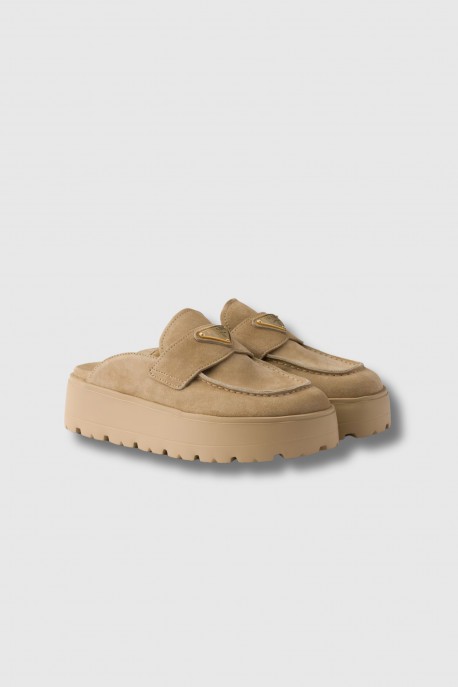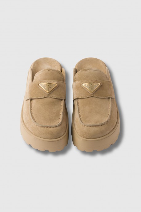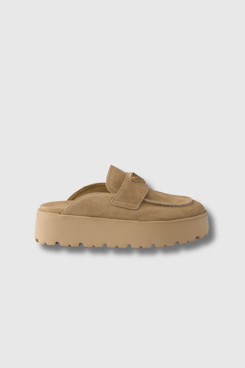Ces mules à plateforme plate en veau velours beige sont signées Prada. Confectionnées en veau velours doux, elles marient un savoir-faire artisanal à une allure moderne et sportive. La semelle à plateforme crantée en gomme de 4,5 cm contraste élégamment avec la tige classique ornée d’une bride en cuir et du logo triangulaire en métal émaillé. Une pièce audacieuse, à la fois confortable et contemporaine.