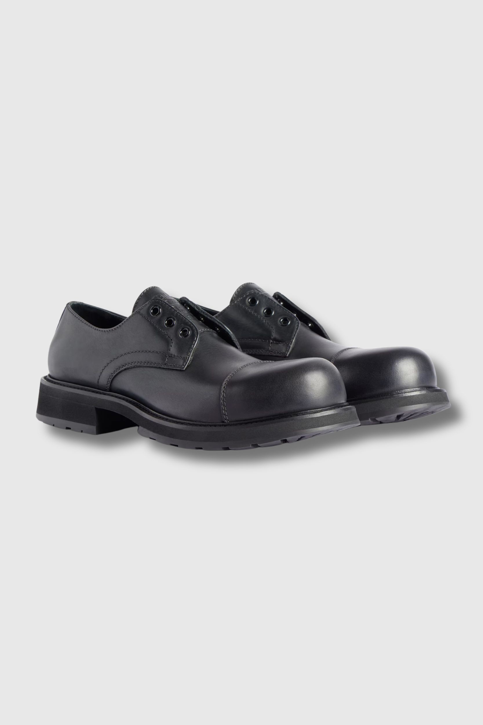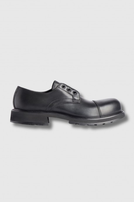 Ces derbys Truck en cuir noir sont signées Balenciaga. Confectionnées en cuir de taureau souple, elles présentent un bout extra-rond et une cambrure de 15 mm. Leur design versatile permet un porté avec ou sans lacets. Les surpiqûres ton sur ton apparentes et l’effet usé sur la semelle extérieure leur confèrent un caractère affirmé. Elles sont ornées des logos Balenciaga et “10 Av. George V Paris” débossés sur la languette, ainsi que du logo embossé à l’arrière du talon. Modèle lacé à trois œillets, livré avec une paire de lacets assortie.